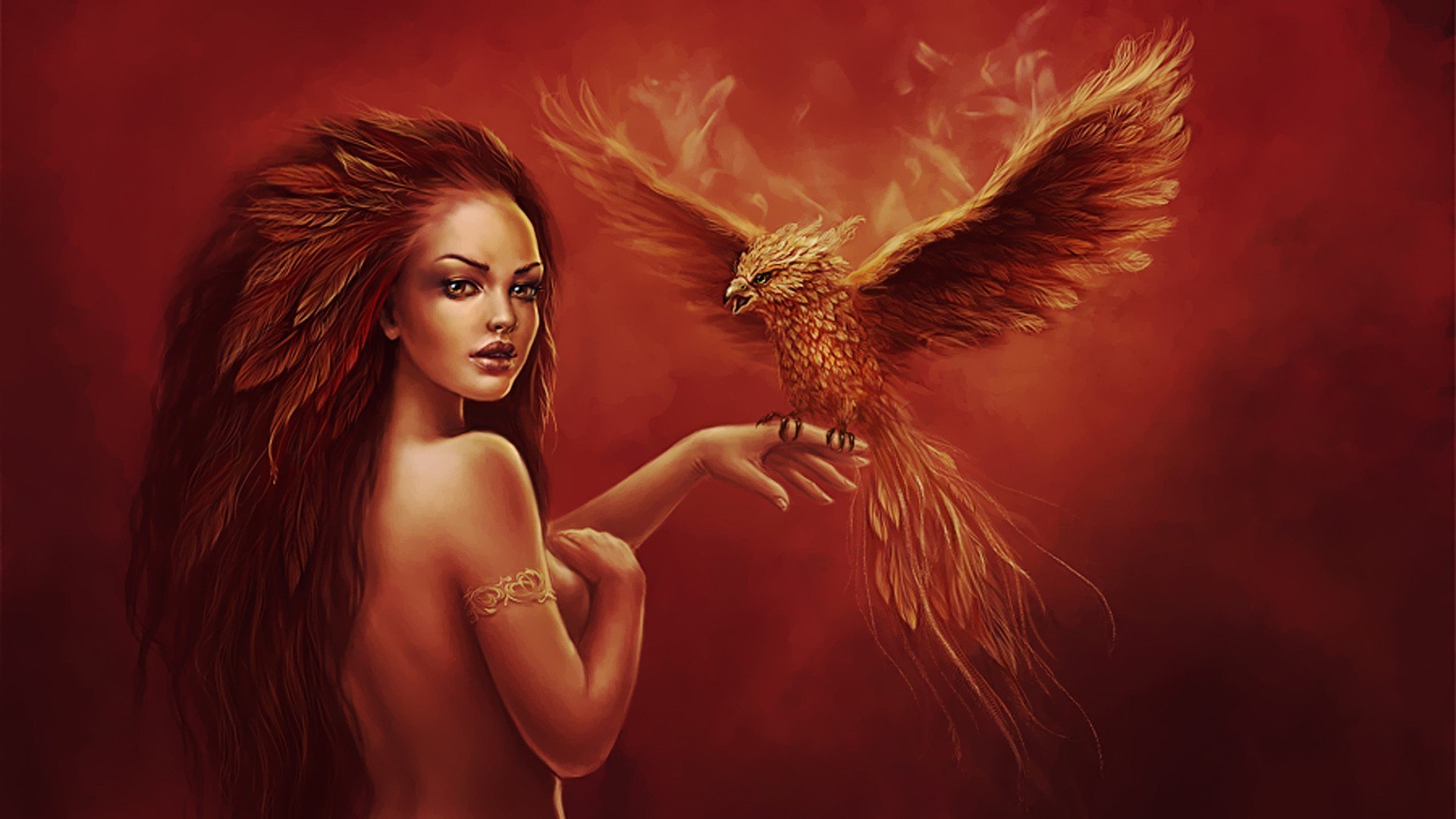 Mädchen mit einem Vogel auf dem Arm. der Phönix-Vogel. mädchen Vogel