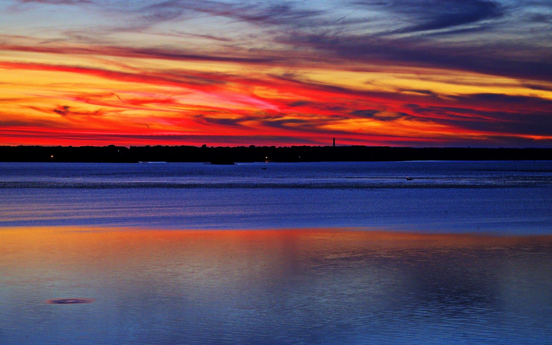 Reflexion des Sonnenuntergangs im See. Roter Sonnenuntergang