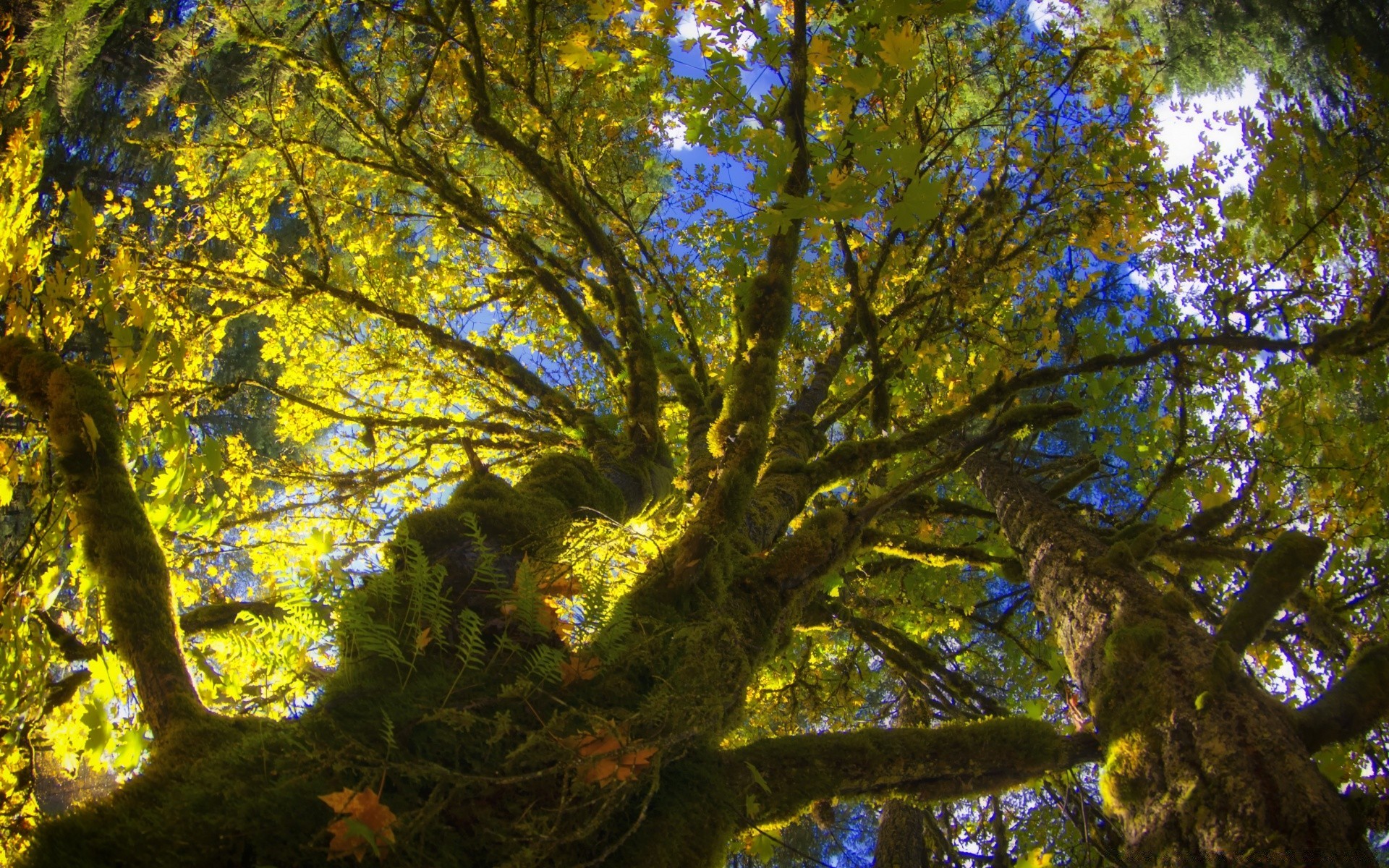 Einsamer Pavillon inmitten von Weihnachtsbäumen und Blättern