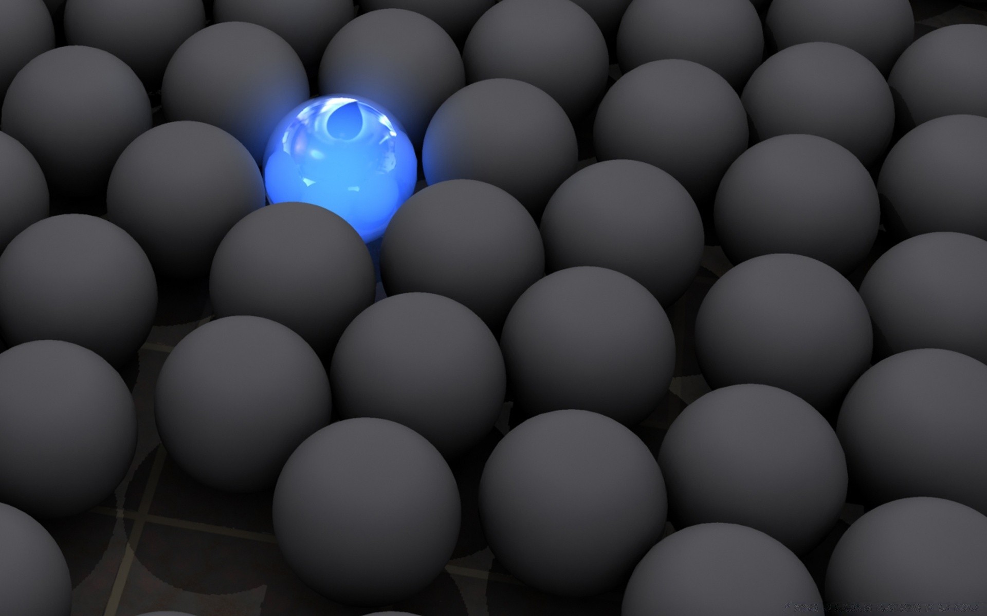 Eine leuchtende Kugel unter einem Dutzend grauen Kugeln