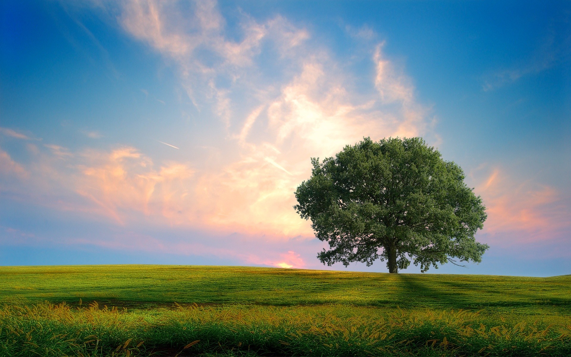 Schöne Landschaft. Schöner Himmel. Der Baum. Gras