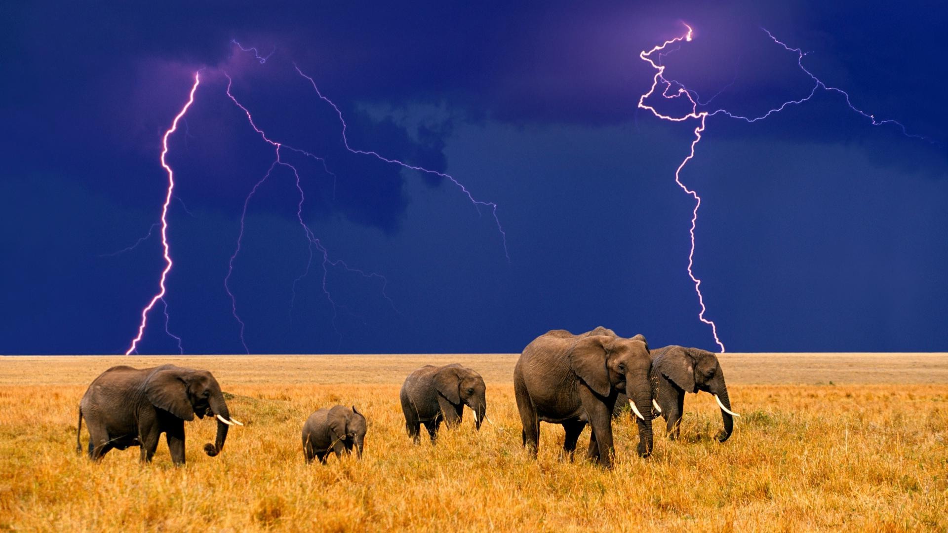 Elefantenfamilie in der Savanne während eines herannahenden Gewitters