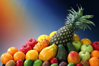 Ein Berg von Früchten auf einem bunten Hintergrund