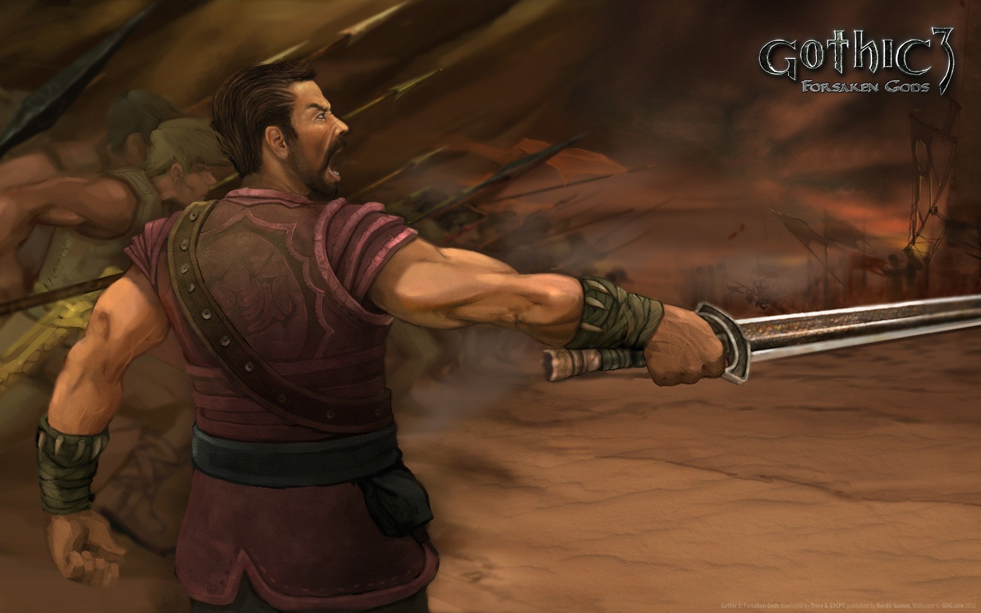 Ein Krieger mit einem Schwert kämpft gegen die Wilden