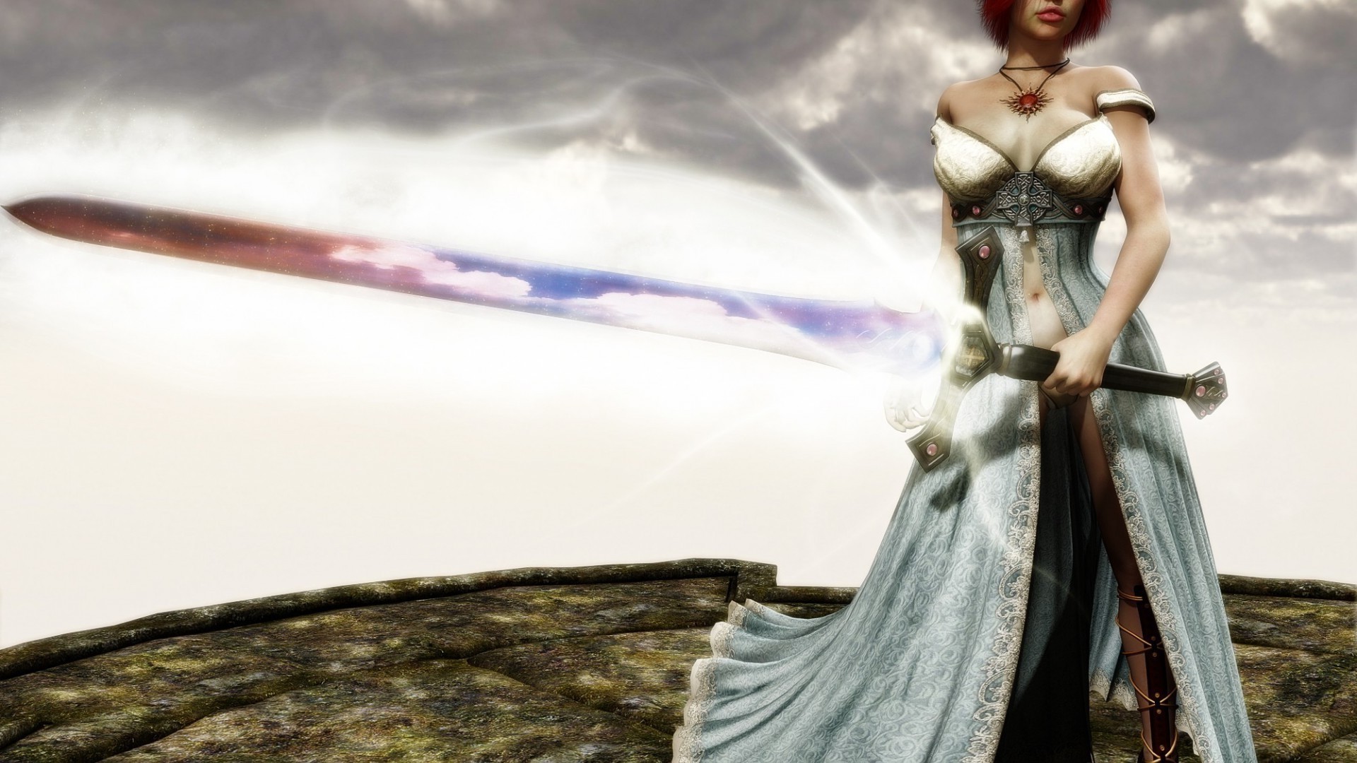Eine Kriegerin mit einem großen Schwert auf dem Feld