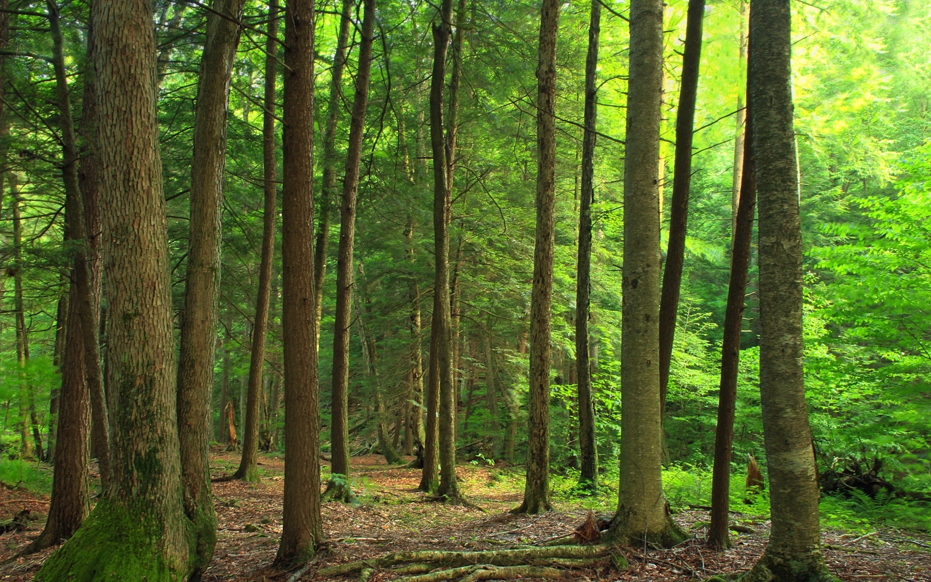 Bäume mit geraden, flachen Stämmen im grünen Wald