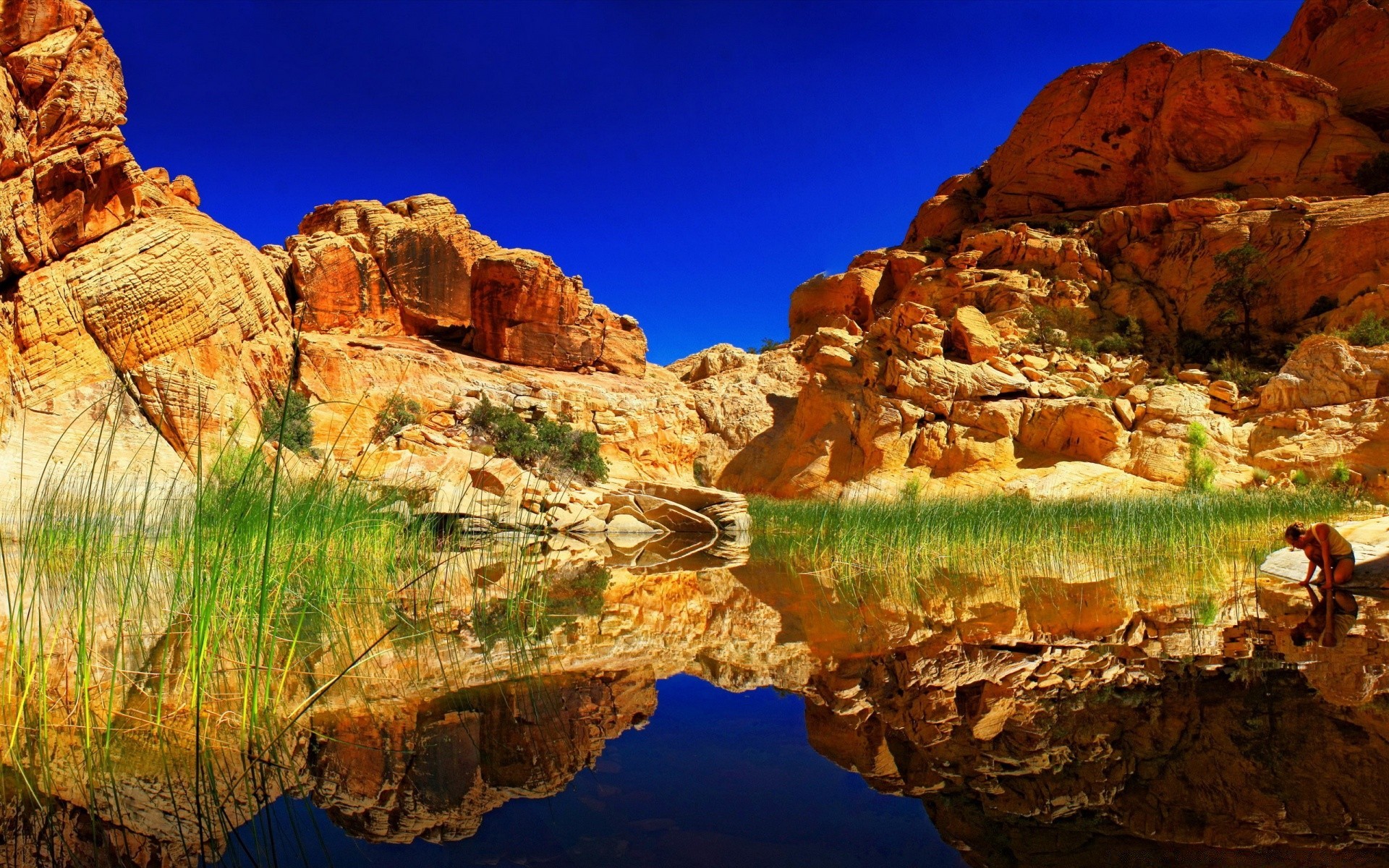 Das felsige Ufer vor dem Hintergrund des klaren Himmels spiegelt sich in den Gewässern des Flusses wider