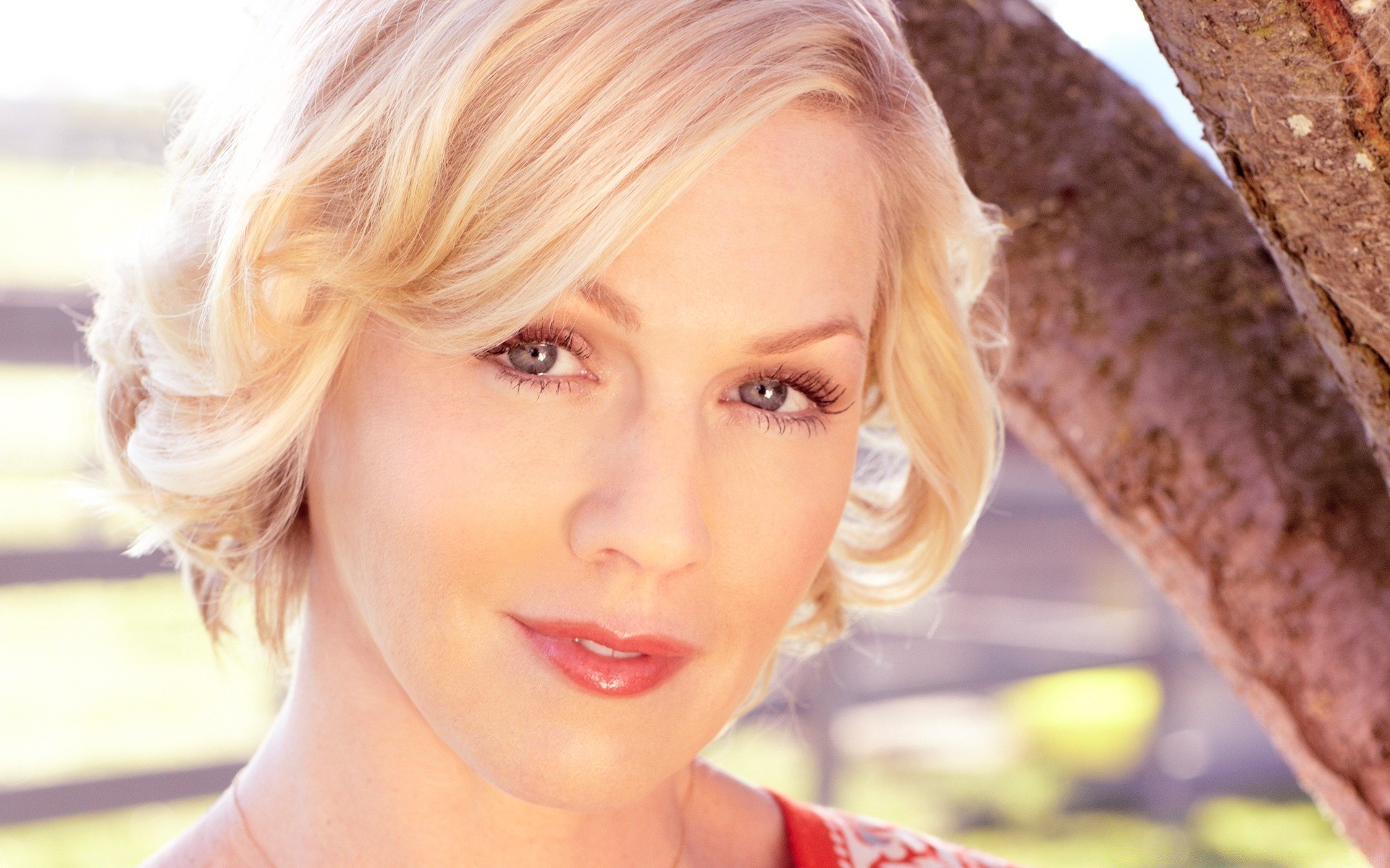 Porträt einer blonden Schauspielerin in der Nähe eines Baumes