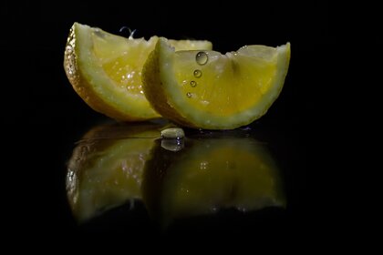 Lemonstücke auf einem Tisch mit einem Spritzer Saft