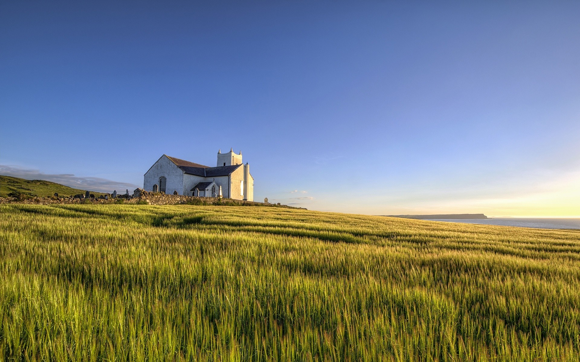 Verschwommenes Gras. Mann in der Nähe des Hauses