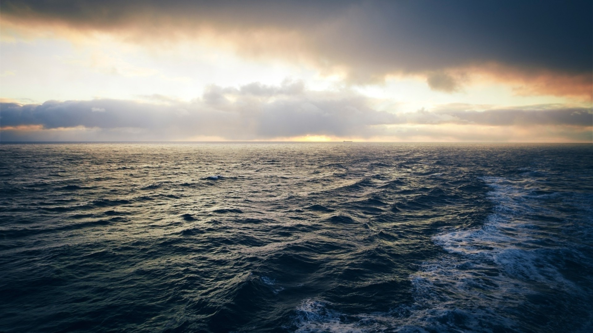 Ein schiff im azurblauen ozean vor dem hintergrund eines klaren himmelsEin Schiff im azurblauen Ozean vor dem Hintergrund eines klaren Himmels