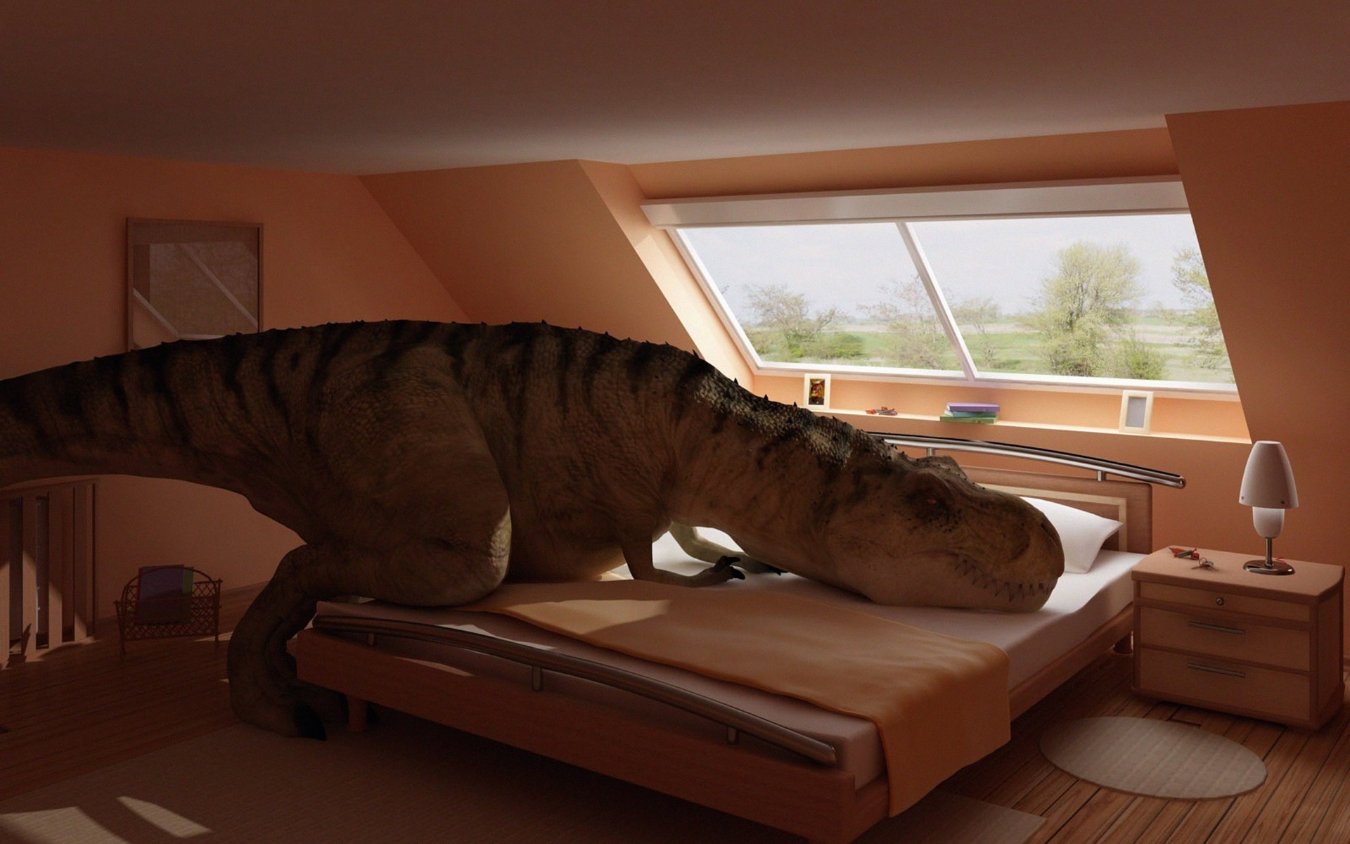 Ein Dinosaurier hat sich auf einem Bett in einer modernen Wohnung niedergelassen