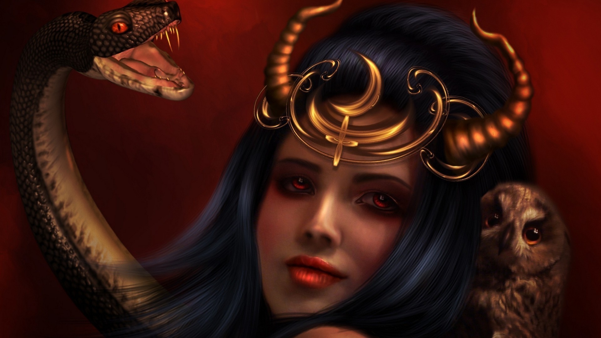 Fantasy-Mädchen mit Schlange mit Hörnern