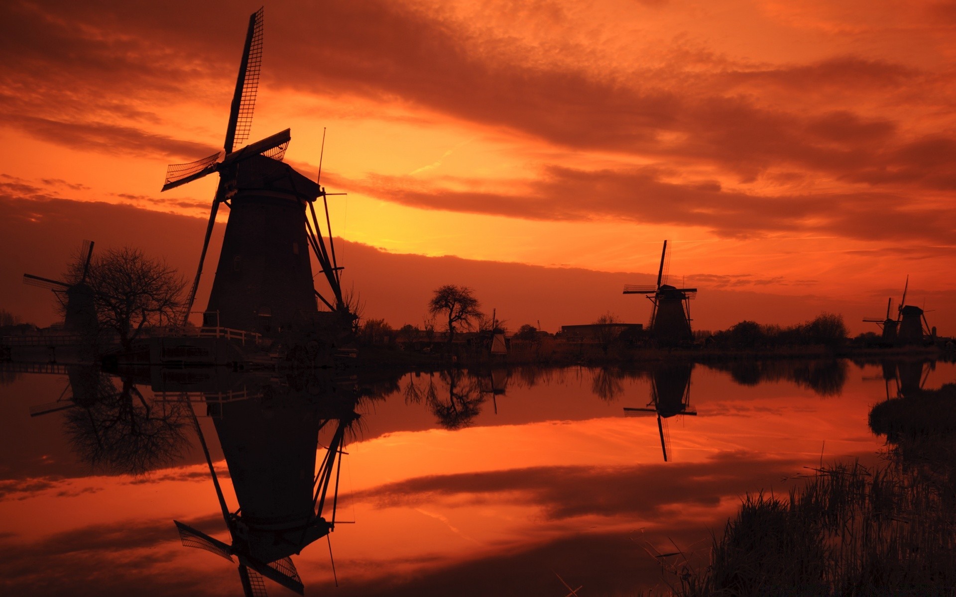 Windmühlen im purpurroten Sonnenuntergang