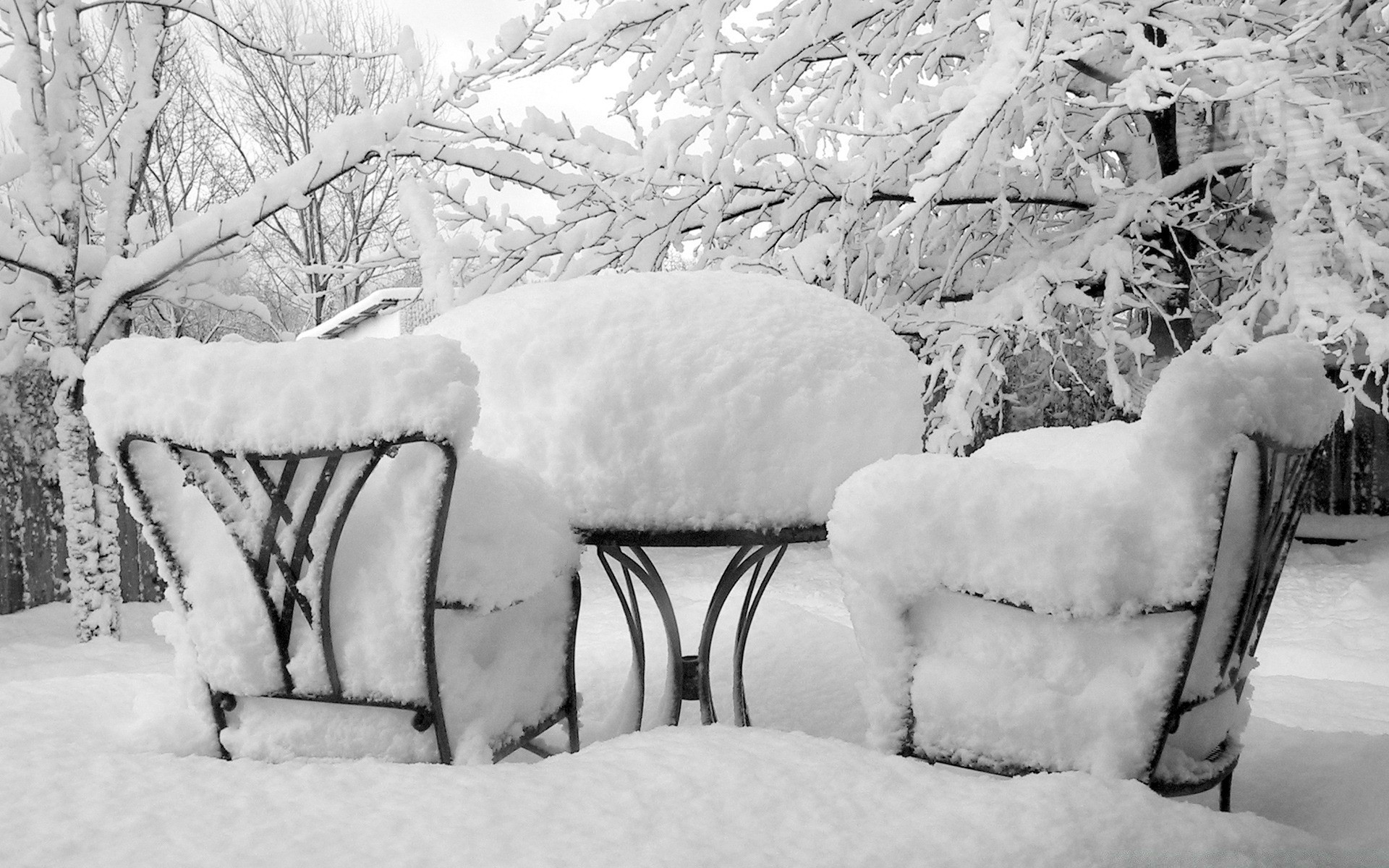 Schneebedeckter Tisch und Stühle