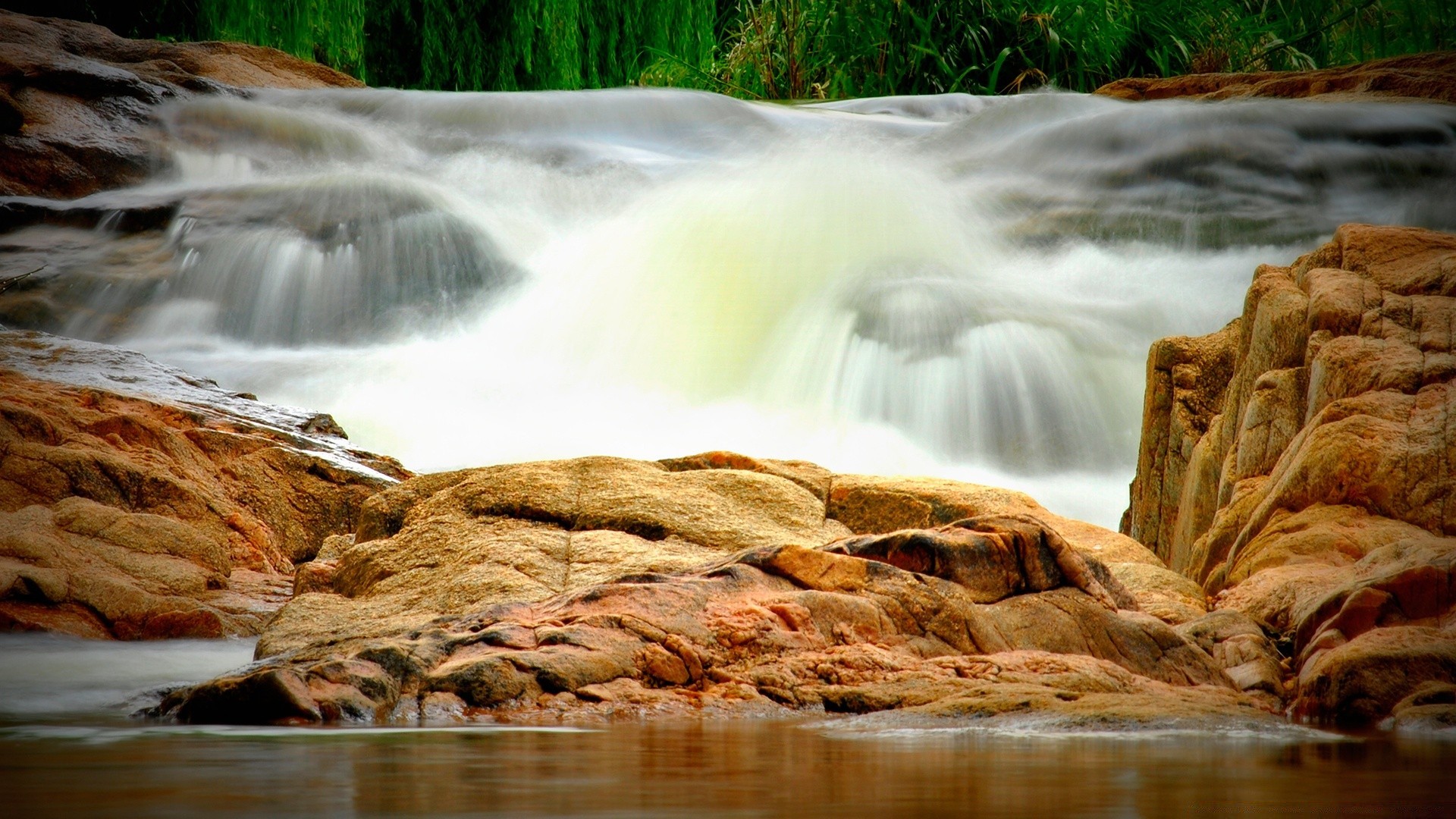 Wasserfall auf dem Hintergrund von Steinen und Fluss