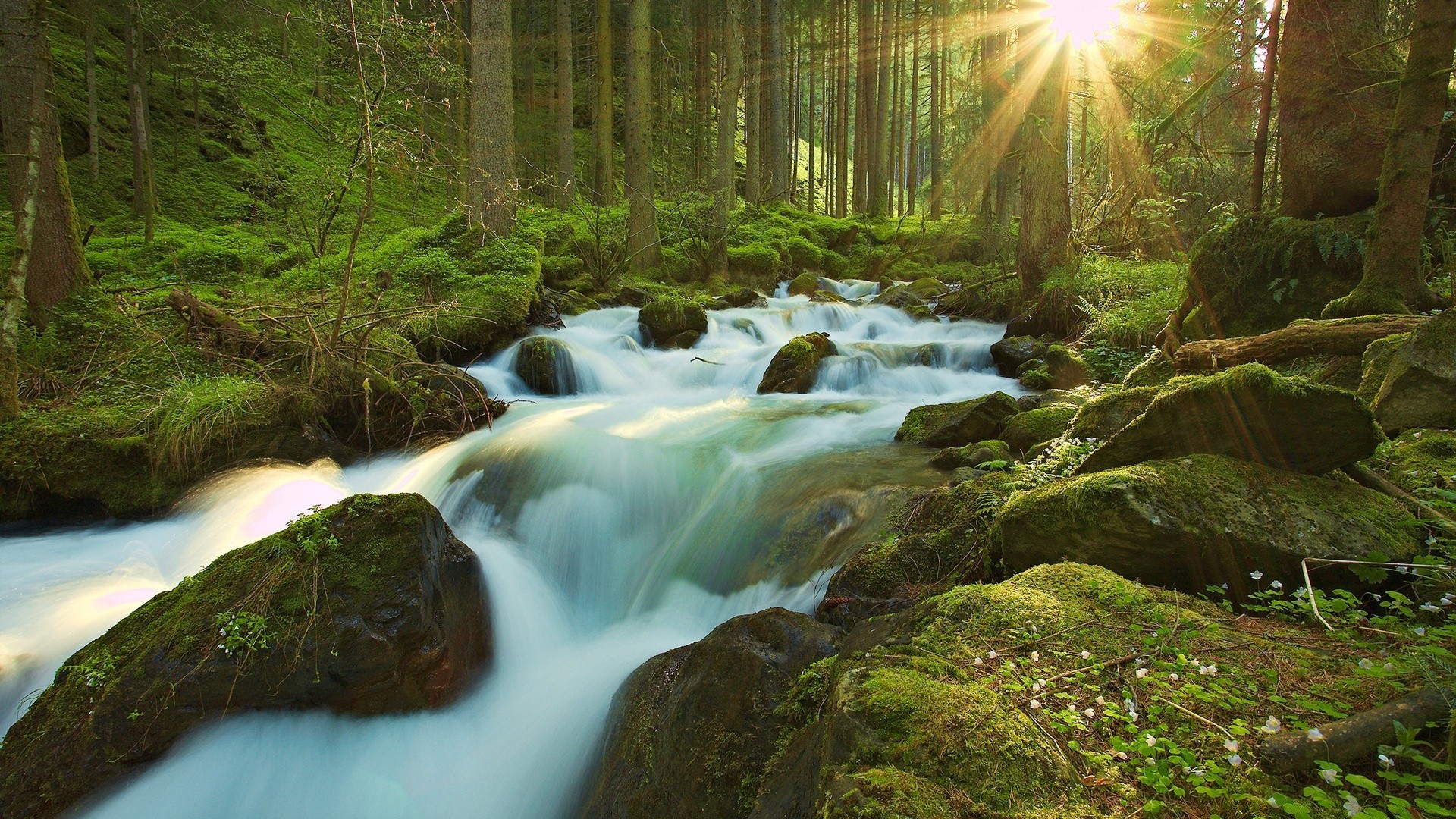 Ein kleiner Fluss läuft zwischen Steinen und Bäumen