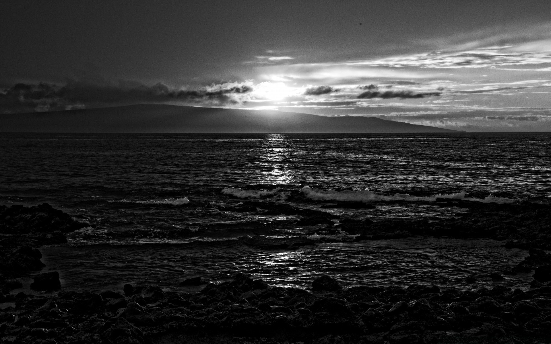 Schwarz-Weiß-Foto des Meereswassers vom Strand vor dem Hintergrund des Sonnenuntergangs