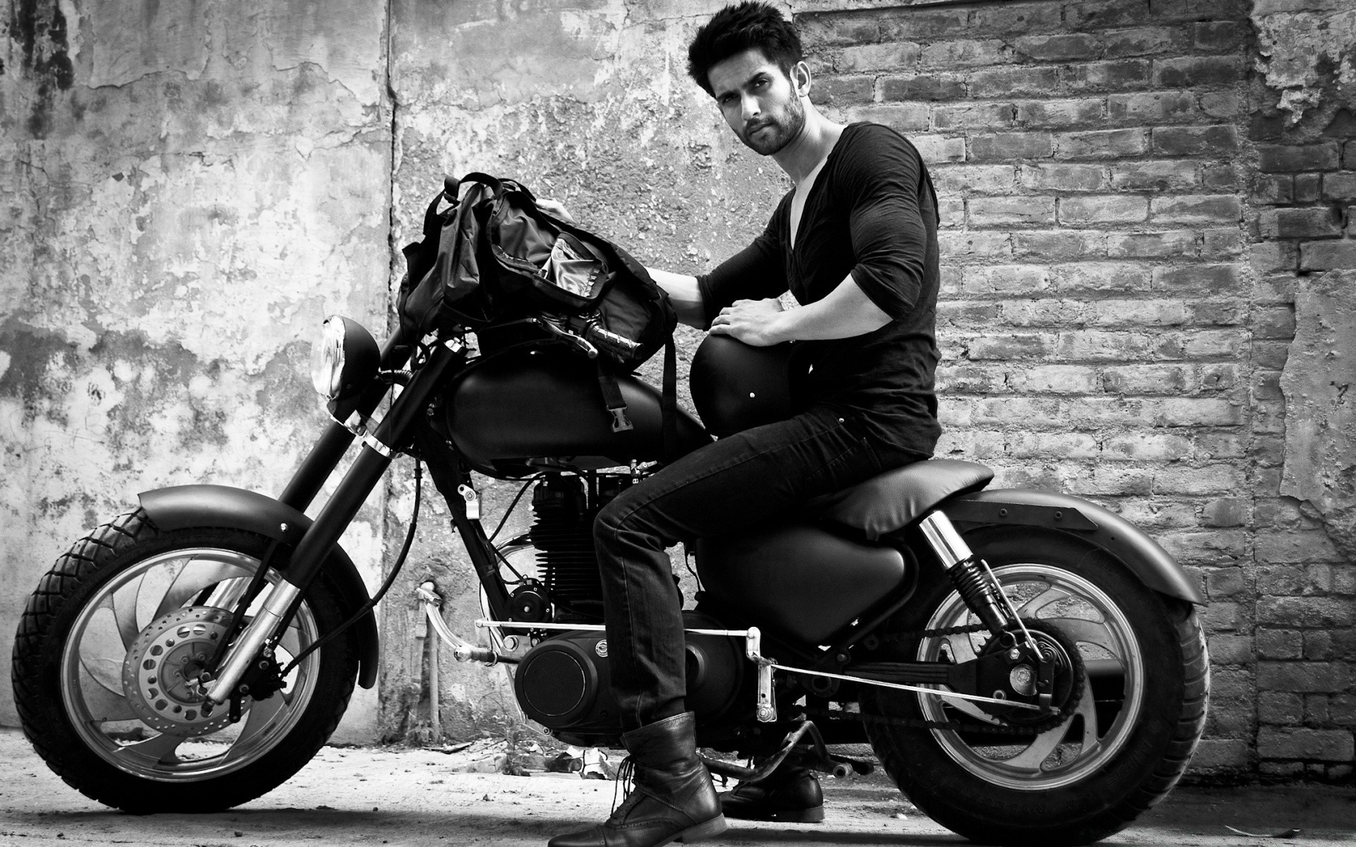 Schwarz-Weiß-Foto eines Bikers auf der Straße