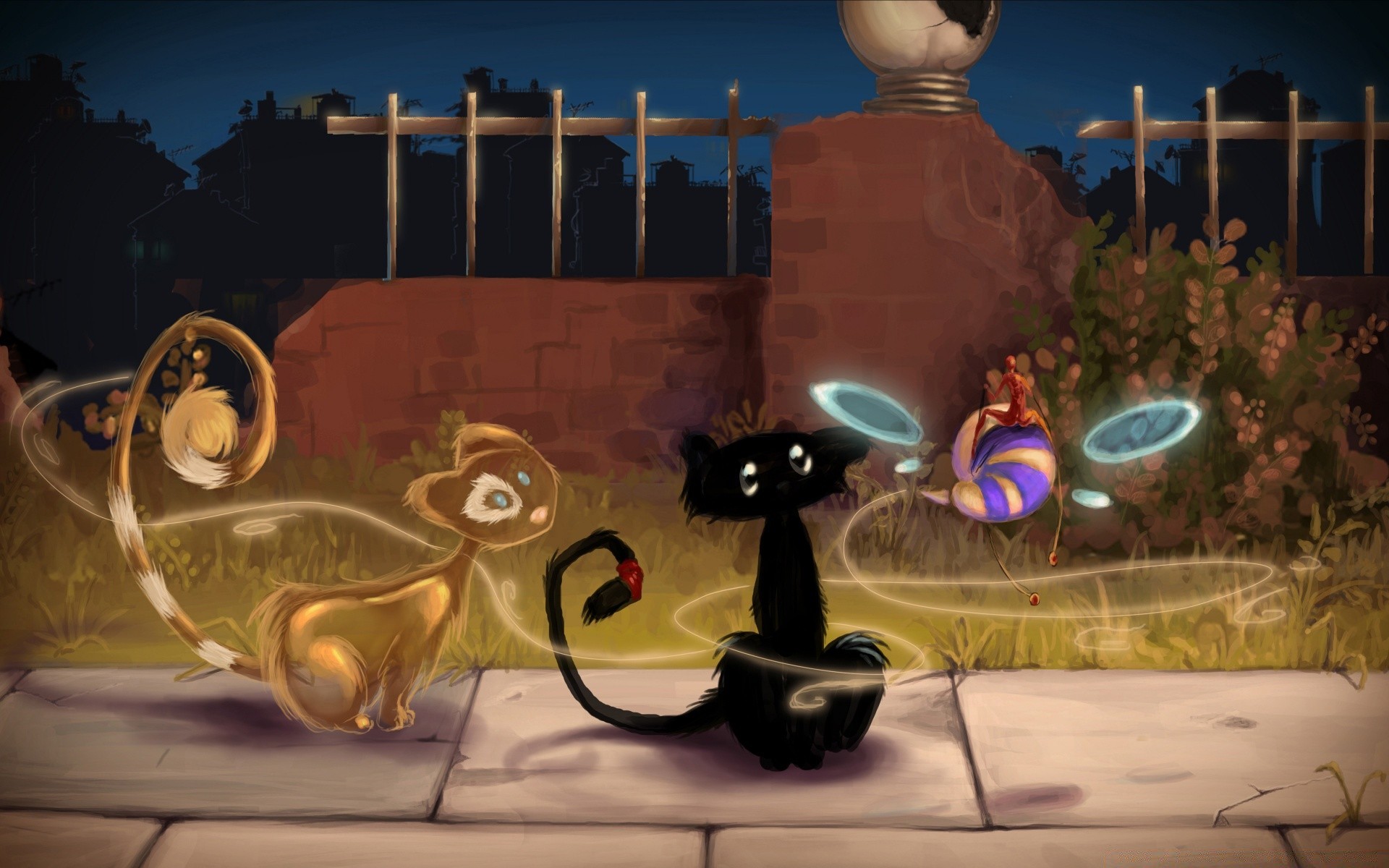 Schwarze und rote Katze sitzen draußen