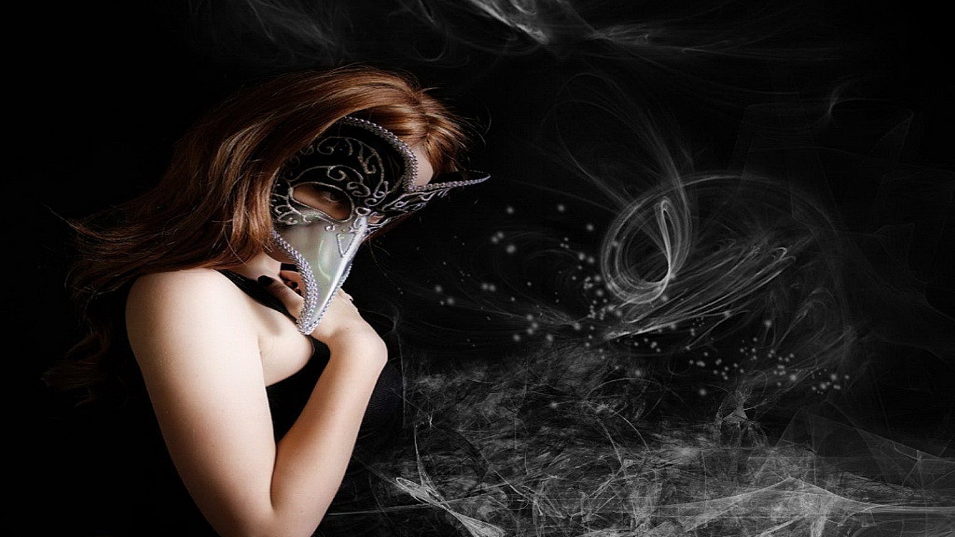 Frau in einer Krähe-Maske auf schwarzem Hintergrund