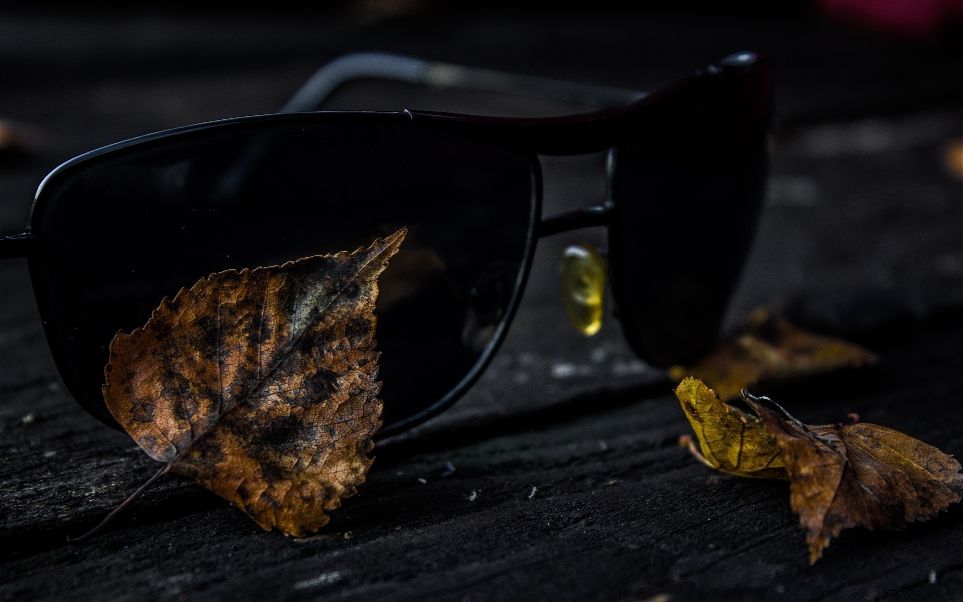 Schwarze brille auf einer bank unter herabfallendem laubSchwarze Brille auf einer Bank unter herabfallendem Laub