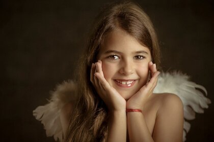 Die frau mit der seitlichen haarnadel in form eines schmetterlings lächelt und schaut zur seiteDie Frau mit der seitlichen Haarnadel in Form eines Schmetterlings lächelt und schaut zur Seite