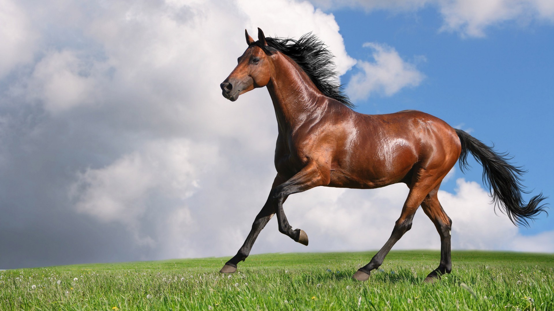 Ein pferd mit weißen hufen. blauer, schöner himmelEin Pferd mit weißen Hufen. Blauer, schöner Himmel