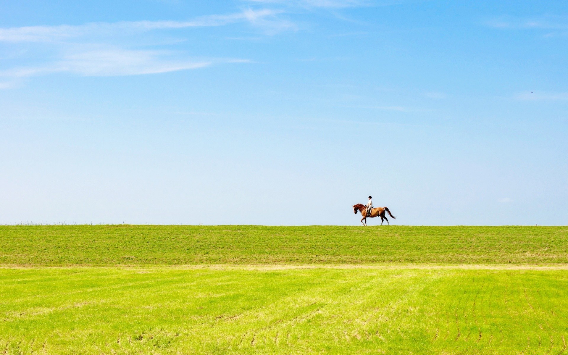 Ein Reiter auf einem Pferd am Horizont im Feld