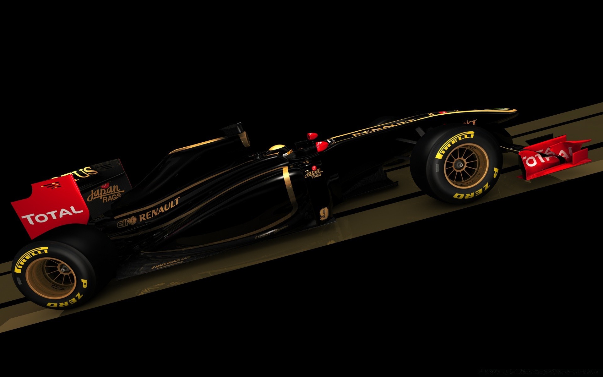 Schwarzes Auto, auf schwarzem Hintergrund. Formel eins, gelbe Räder