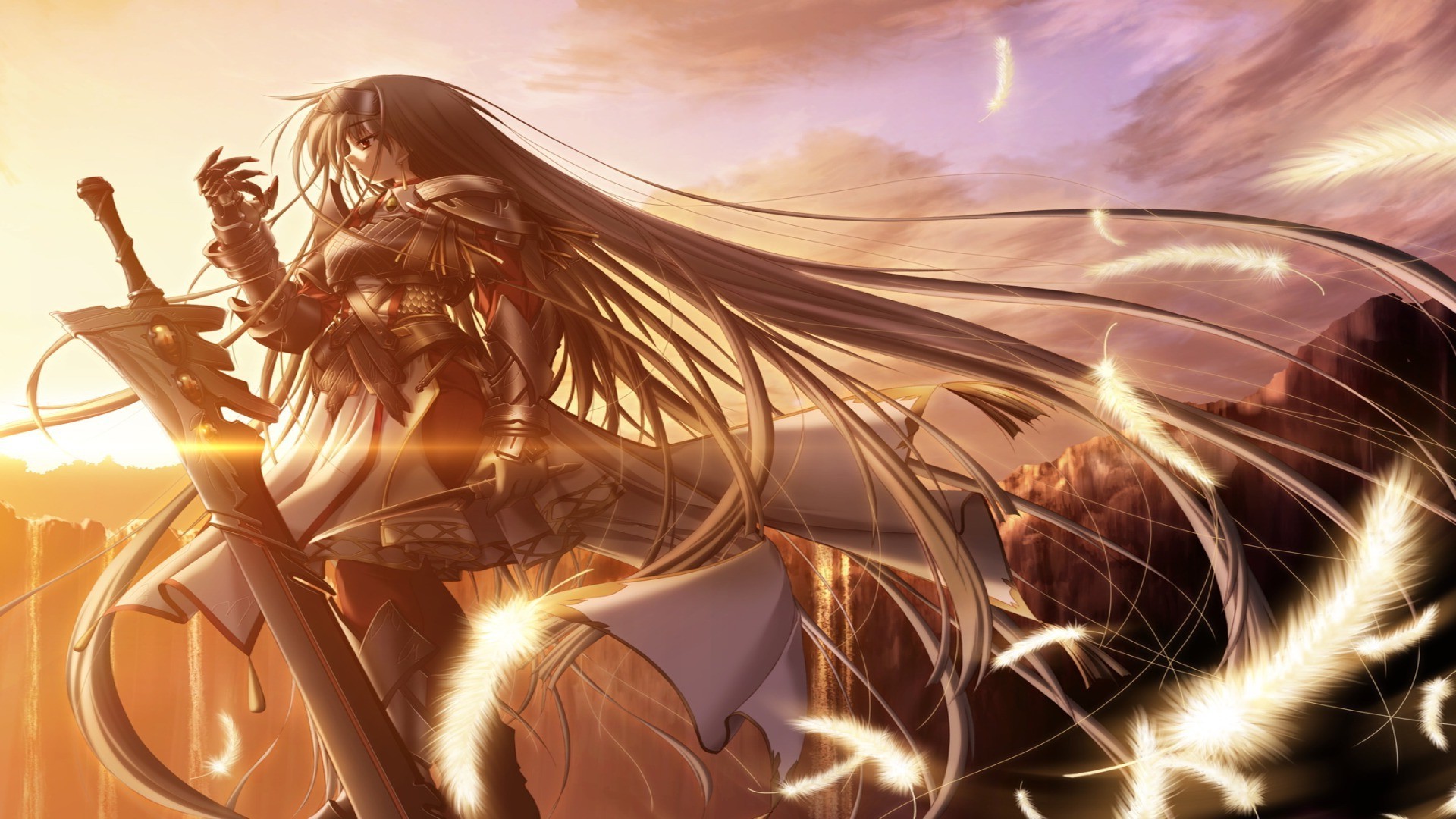 Ein junger weißer Krieger mit einem Schwert in der Hand und einem Trab auf der Schulter