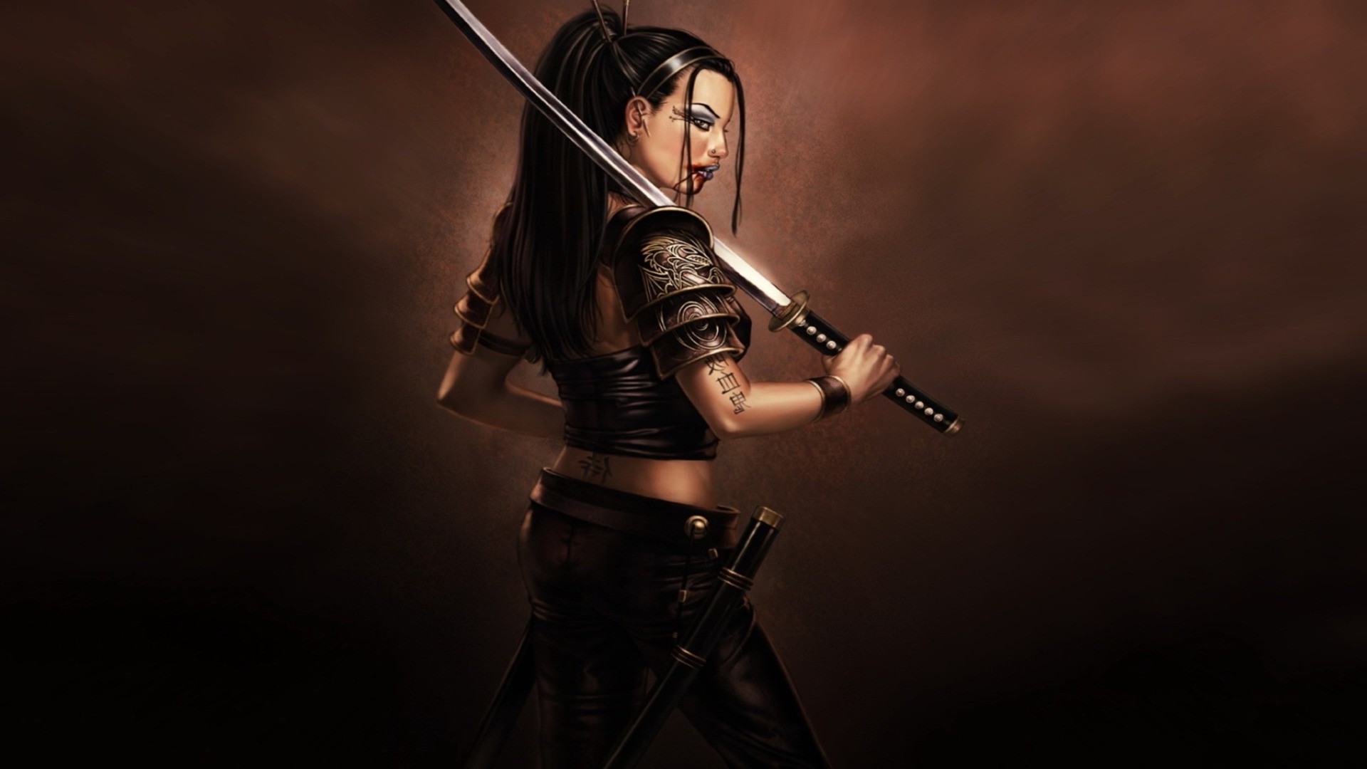 Ein Krieger-Mädchen in schwarz-rotem Gewand mit einem Schwert in einer Scheide