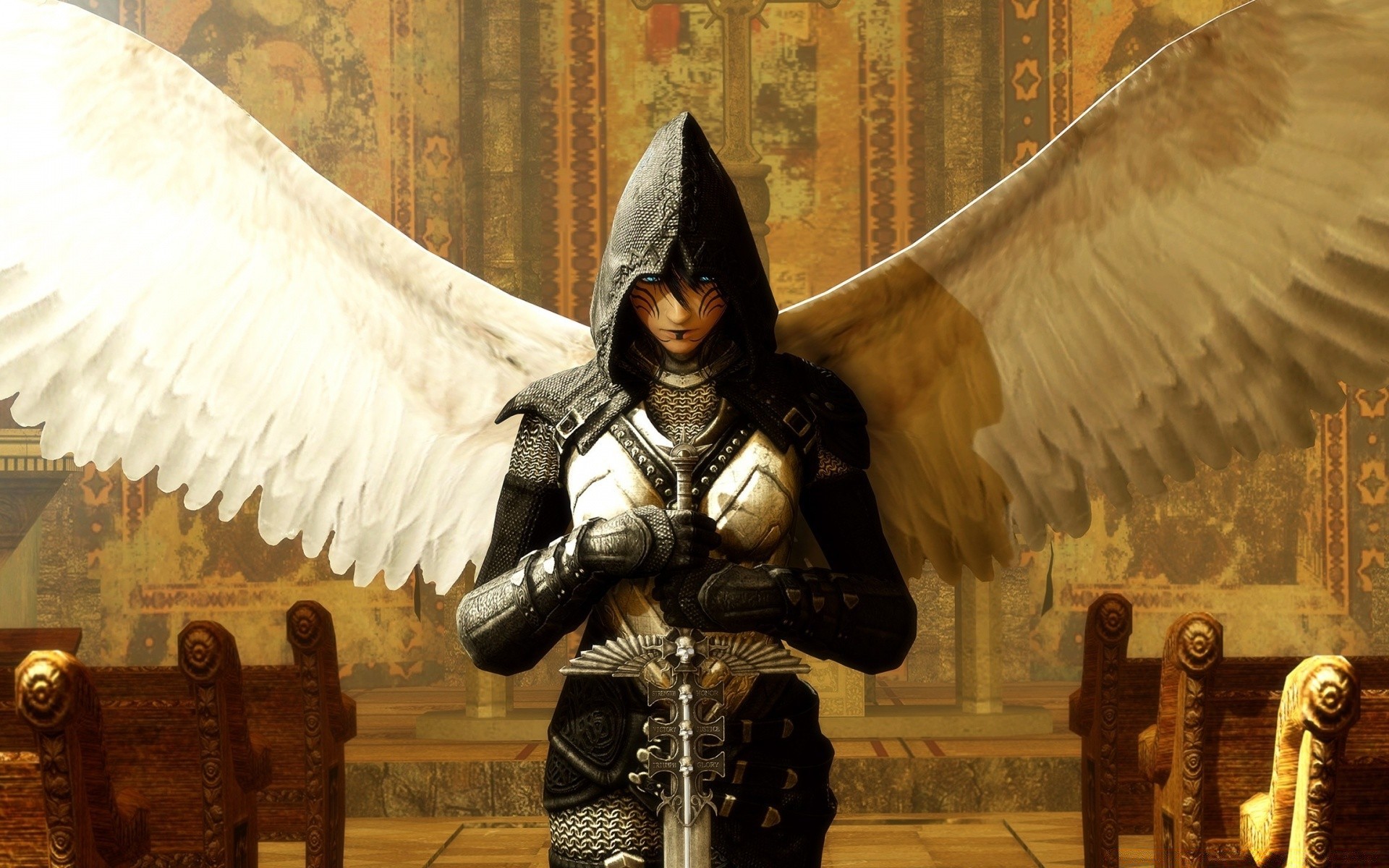 Ein erwachsener Mann mit langen Haaren und einem Schwert in seinen Händen