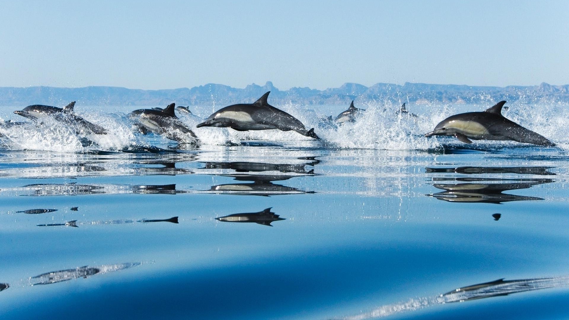 Foto von tummelnden Delfinen vor dem Hintergrund von Eisbergen