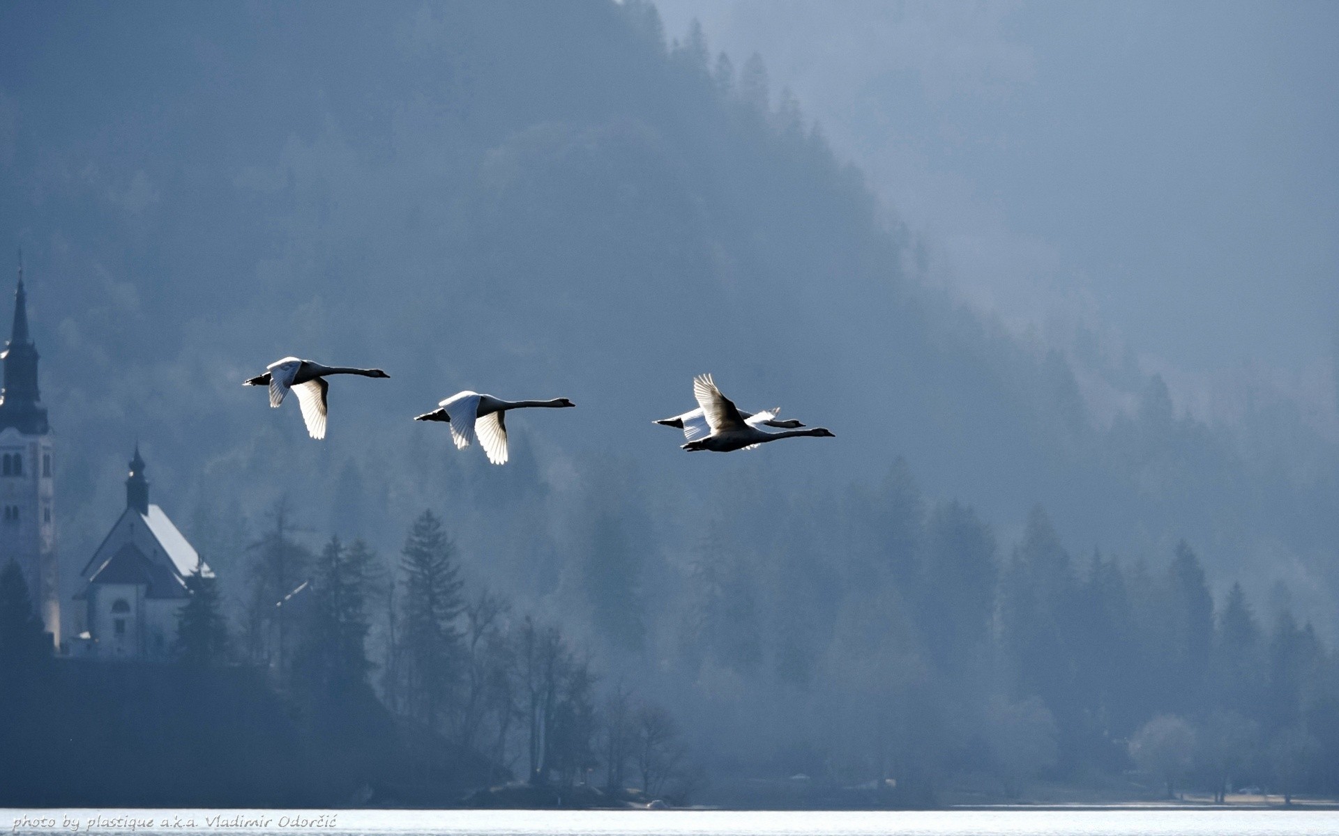 Schwäne fliegen über den See Blut durch Plastik aka Vladimir odorcic