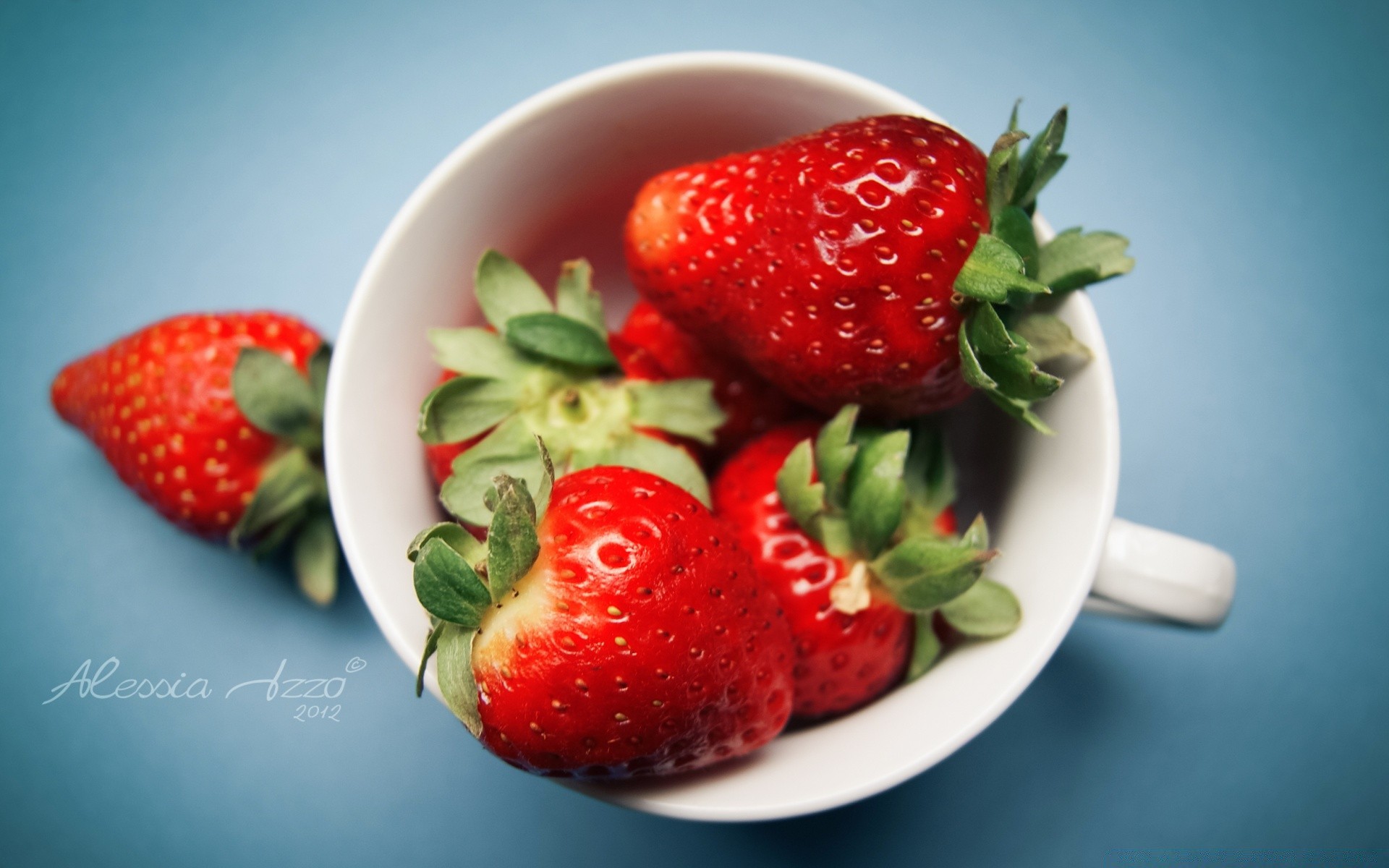 Erdbeeren in einer Tasse auf blauem Hintergrund
