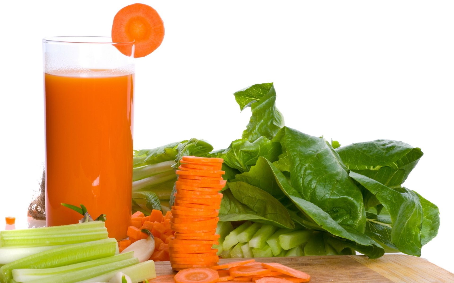 Geschnittenes Gemüse auf dem Tisch und ein Glas Karottensaft