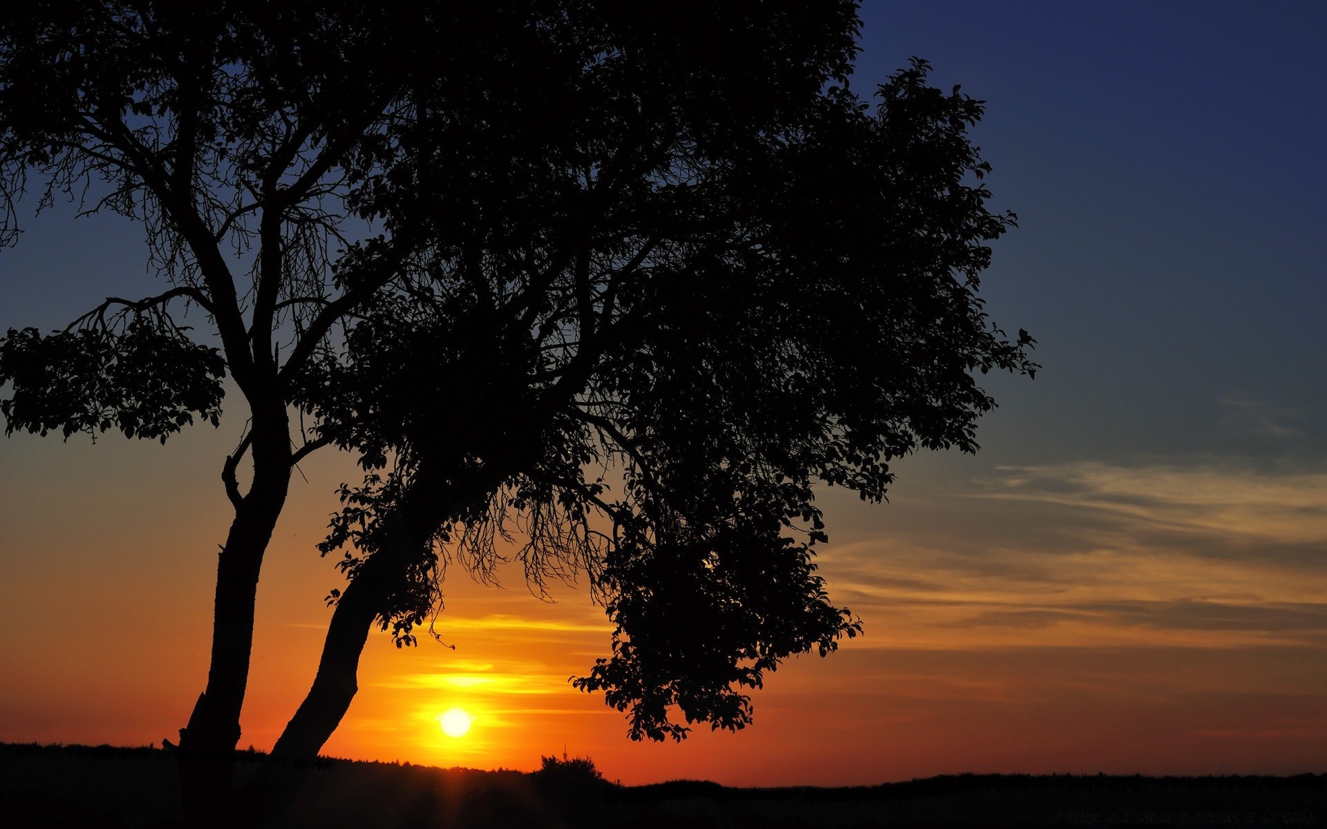 Die helle untergehende Sonne verbirgt sich hinter Laub