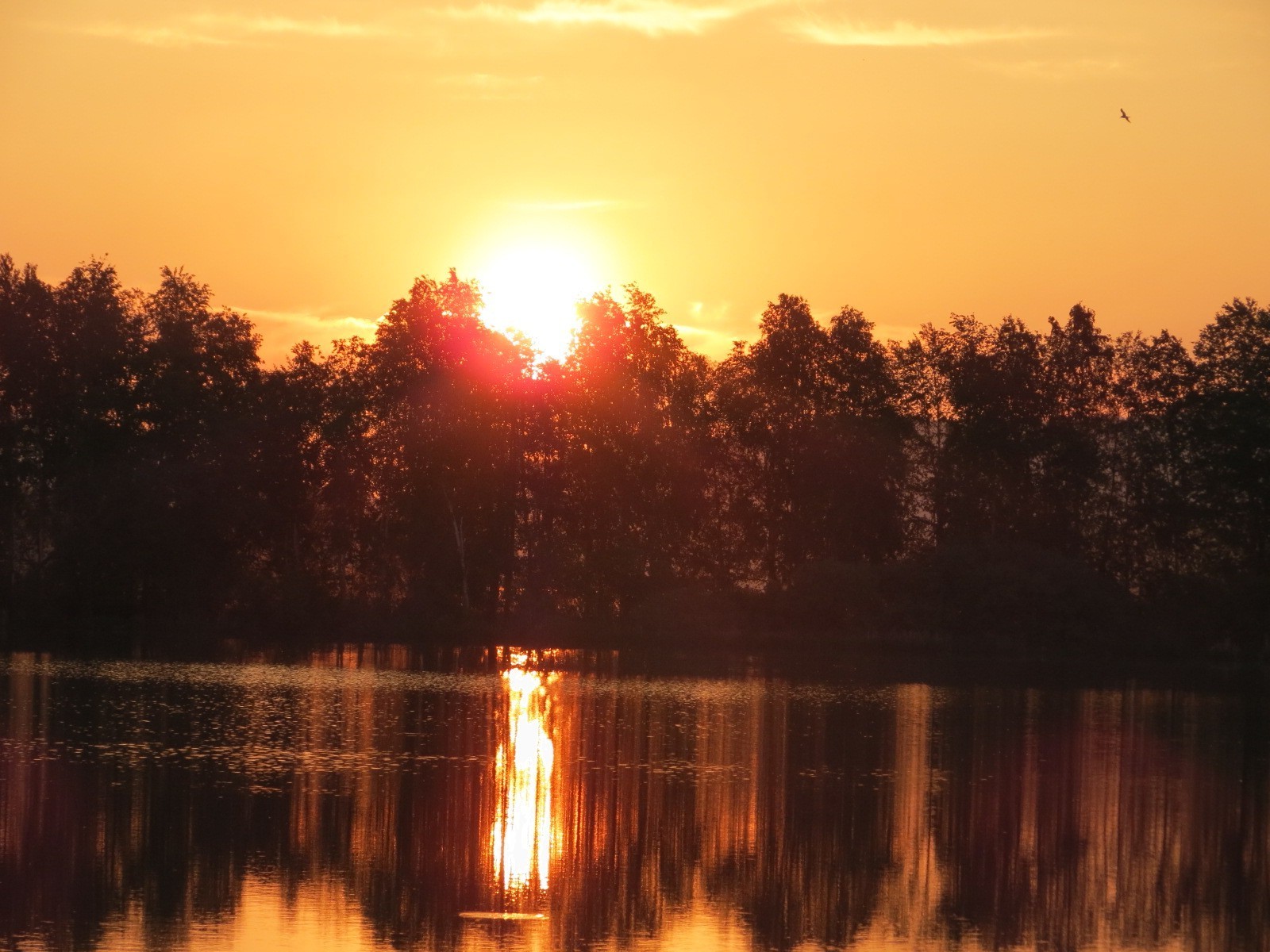Die untergehende sonne, die über den waldrand hinausgeht, spiegelt sich in der wasseroberfläche widerDie untergehende Sonne, die über den Waldrand hinausgeht, spiegelt sich in der Wasseroberfläche wider