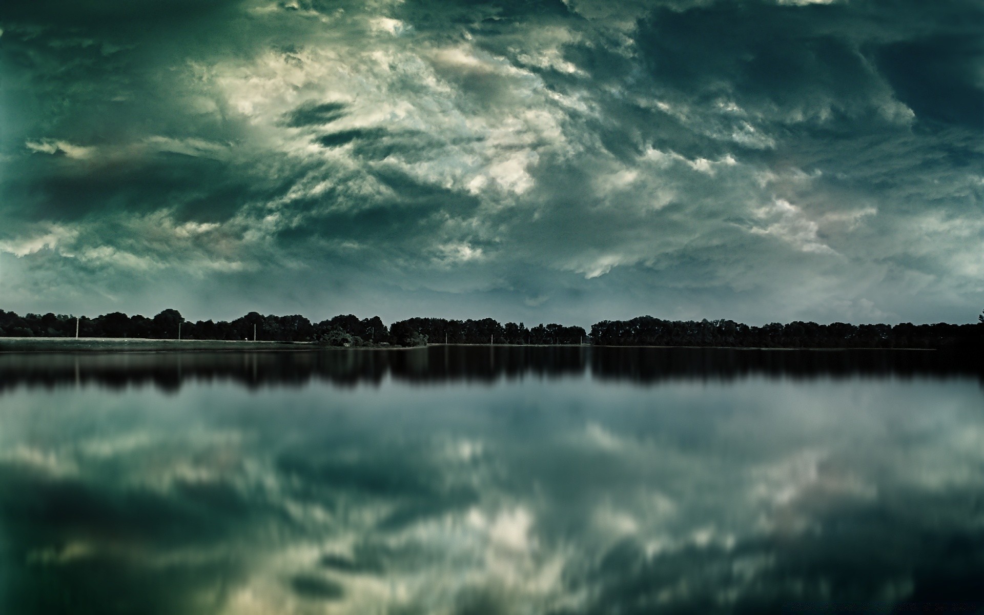 Reflexion des Waldes in einem tiefen See in der Dämmerung