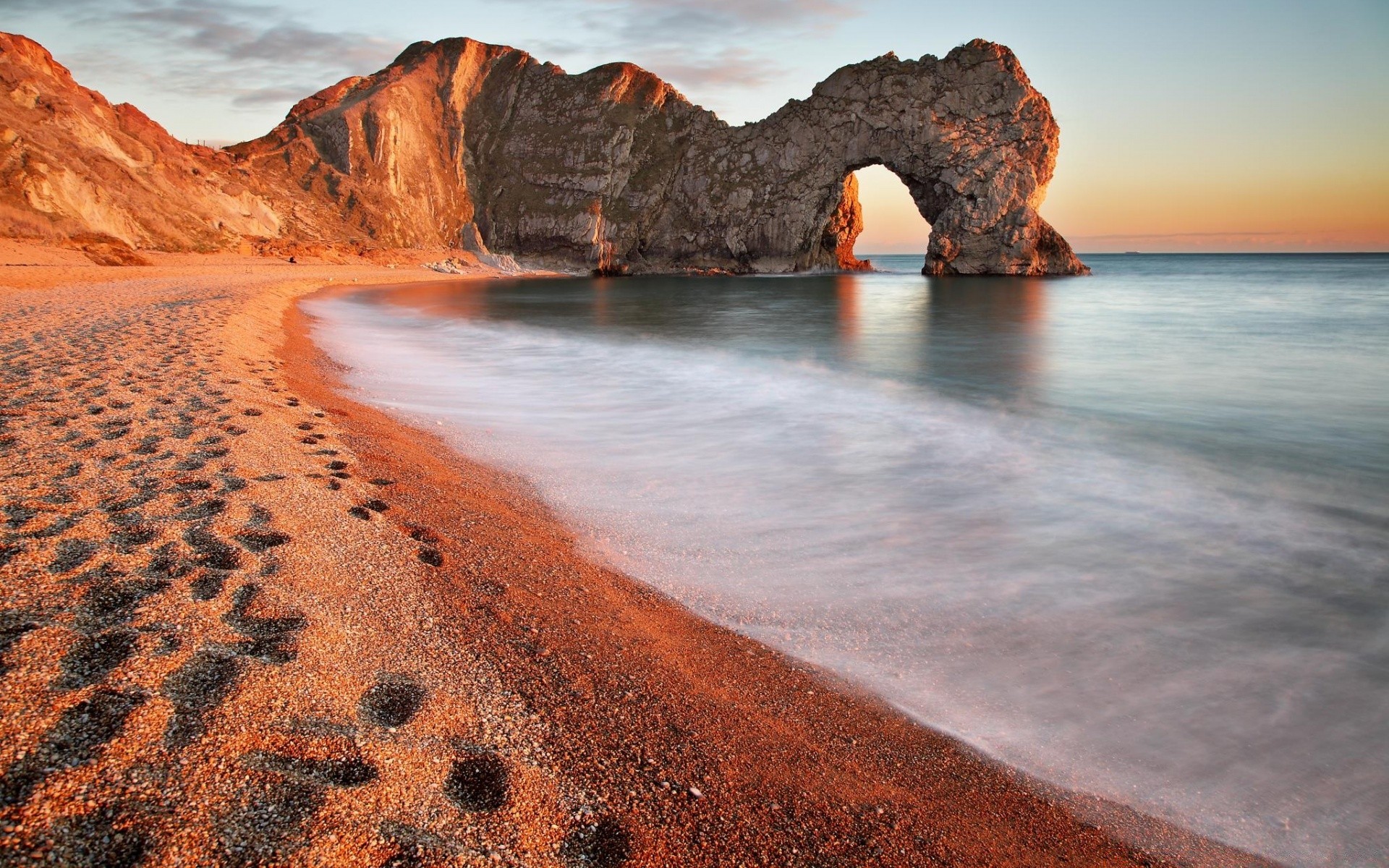 Die steinküste, die letzten strahlen der untergehenden sonne auf dem wasser