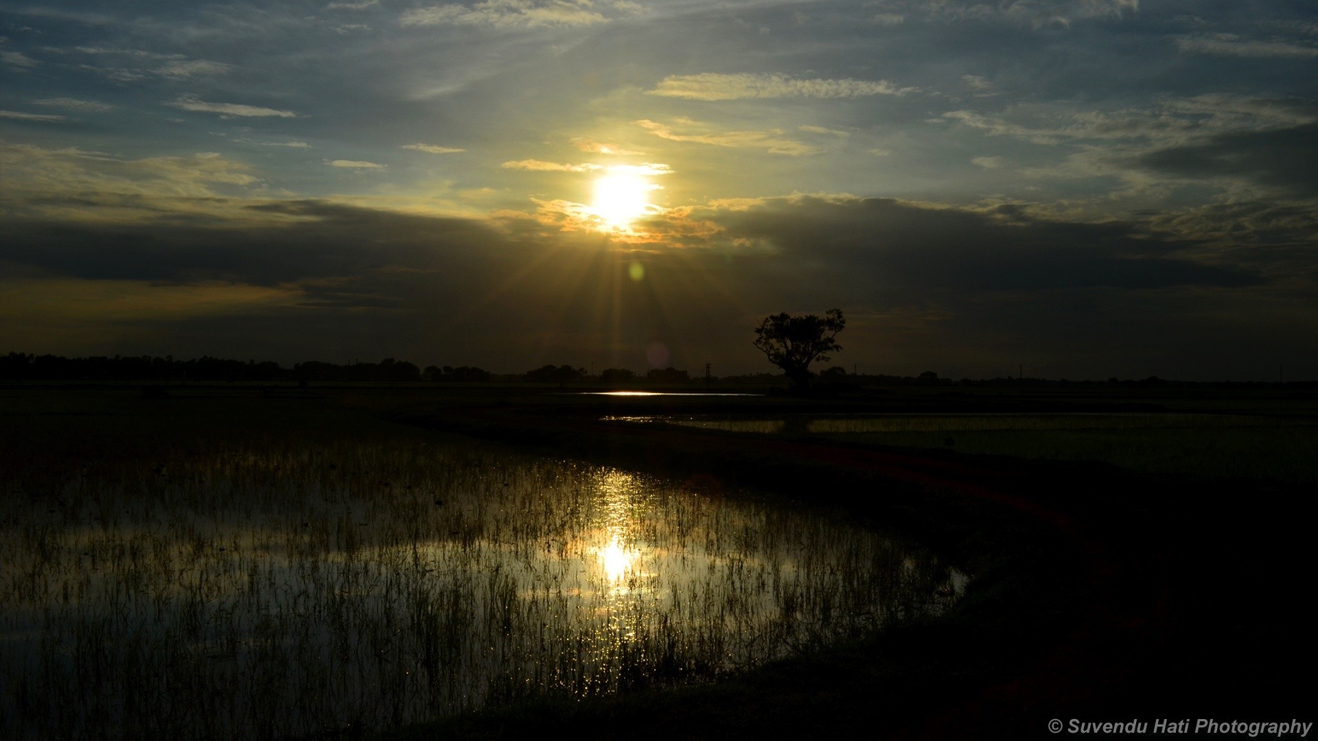 Sonnenuntergang und sonnenaufgang. goldene sonne. dunkles uferSonnenuntergang und Sonnenaufgang. Goldene Sonne. Dunkles Ufer