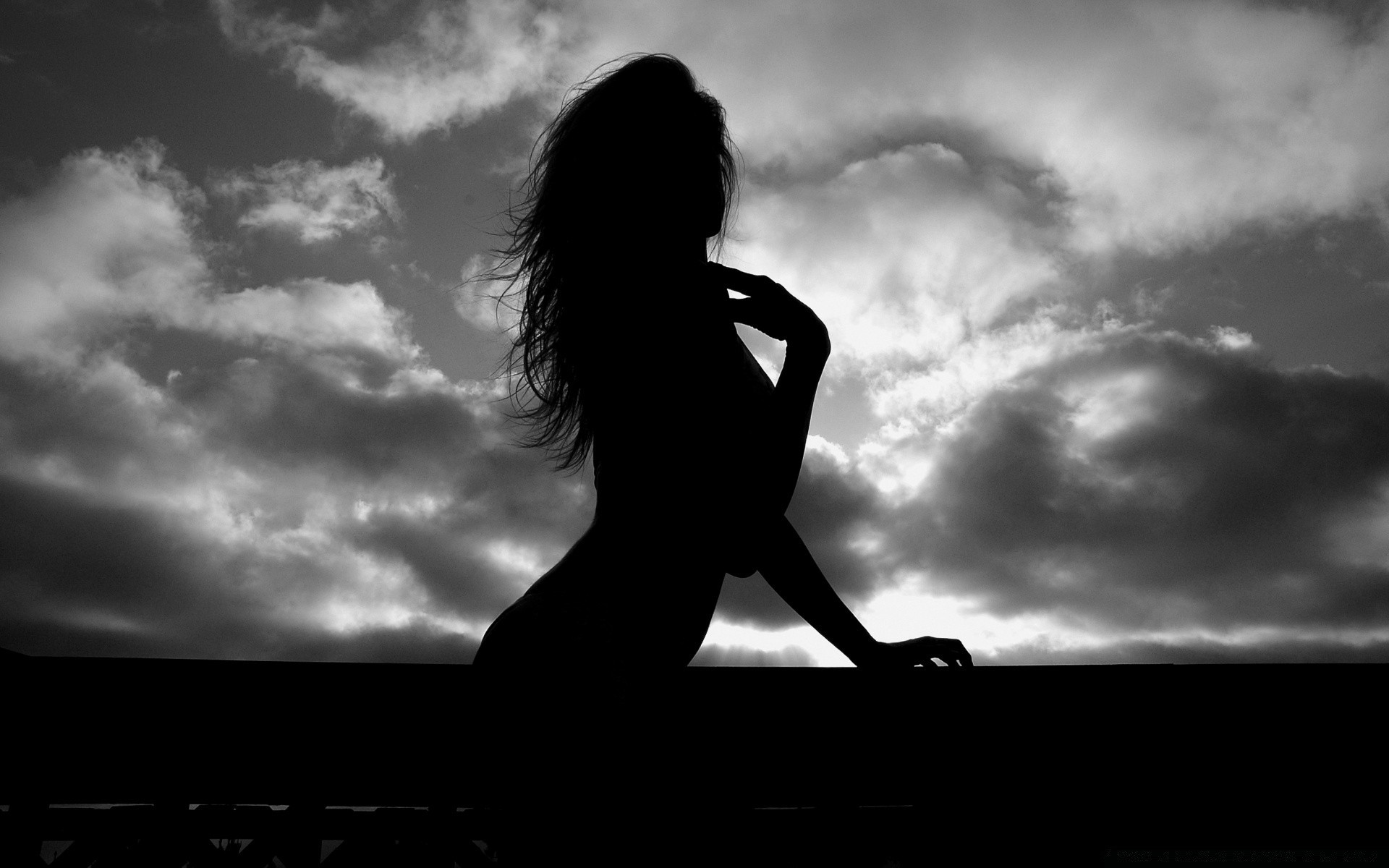 Mädchen auf einem schwarzen und weißen sonnenuntergang hintergrundMädchen auf einem schwarzen und weißen Sonnenuntergang Hintergrund