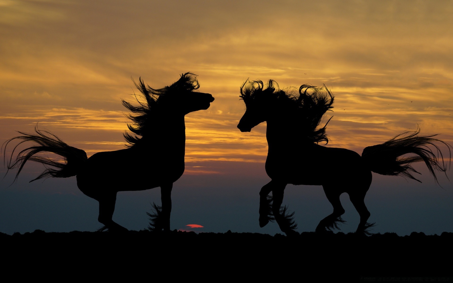 Silhouetten von pferden, die bei sonnenuntergang herumtollenSilhouetten von Pferden, die bei Sonnenuntergang herumtollen