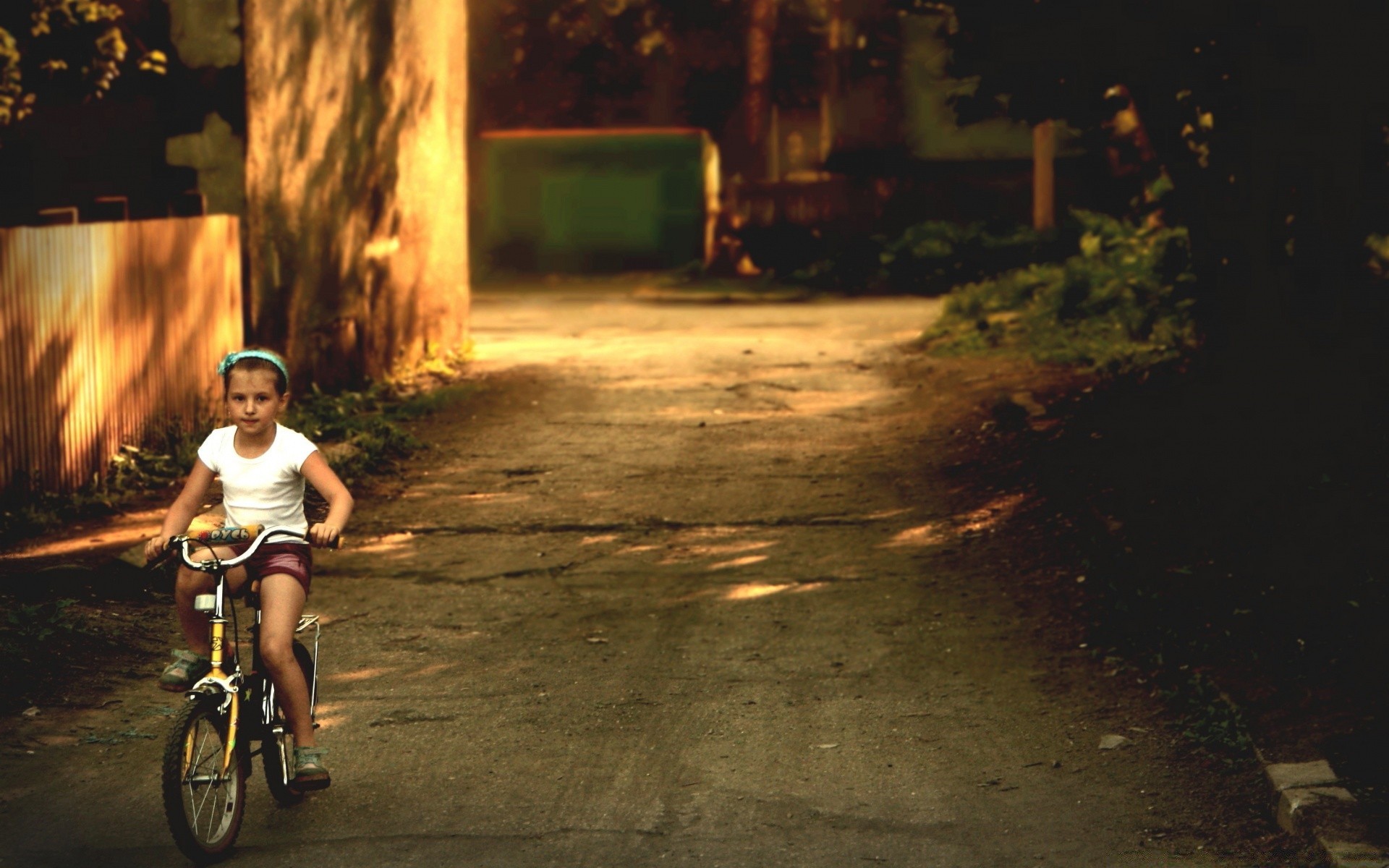 Mädchen mit roten Kugeln auf einem Fahrrad