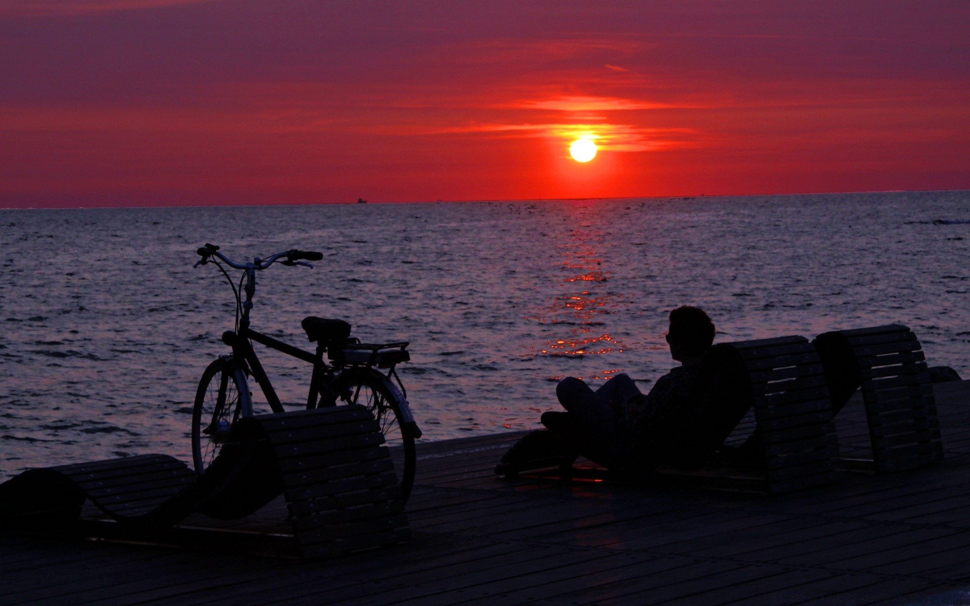 Mann bei Sonnenuntergang am Meer mit Fahrrad