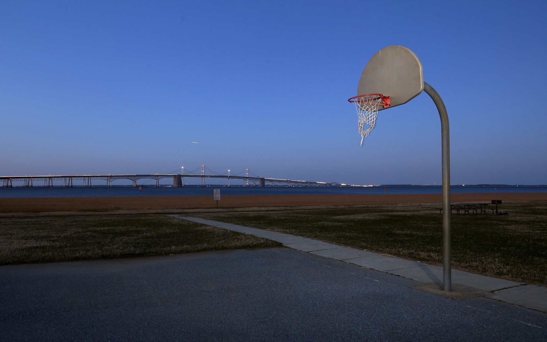 Basketballkorb und Schild auf dem Spielfeld