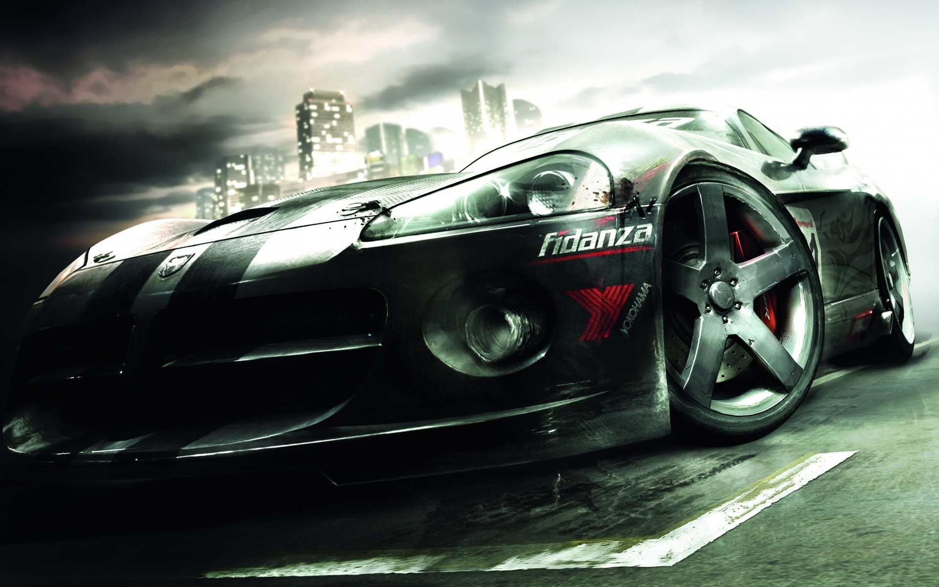 Sportwagen auf der Strecke vor dem Hintergrund der Wolkenkratzer