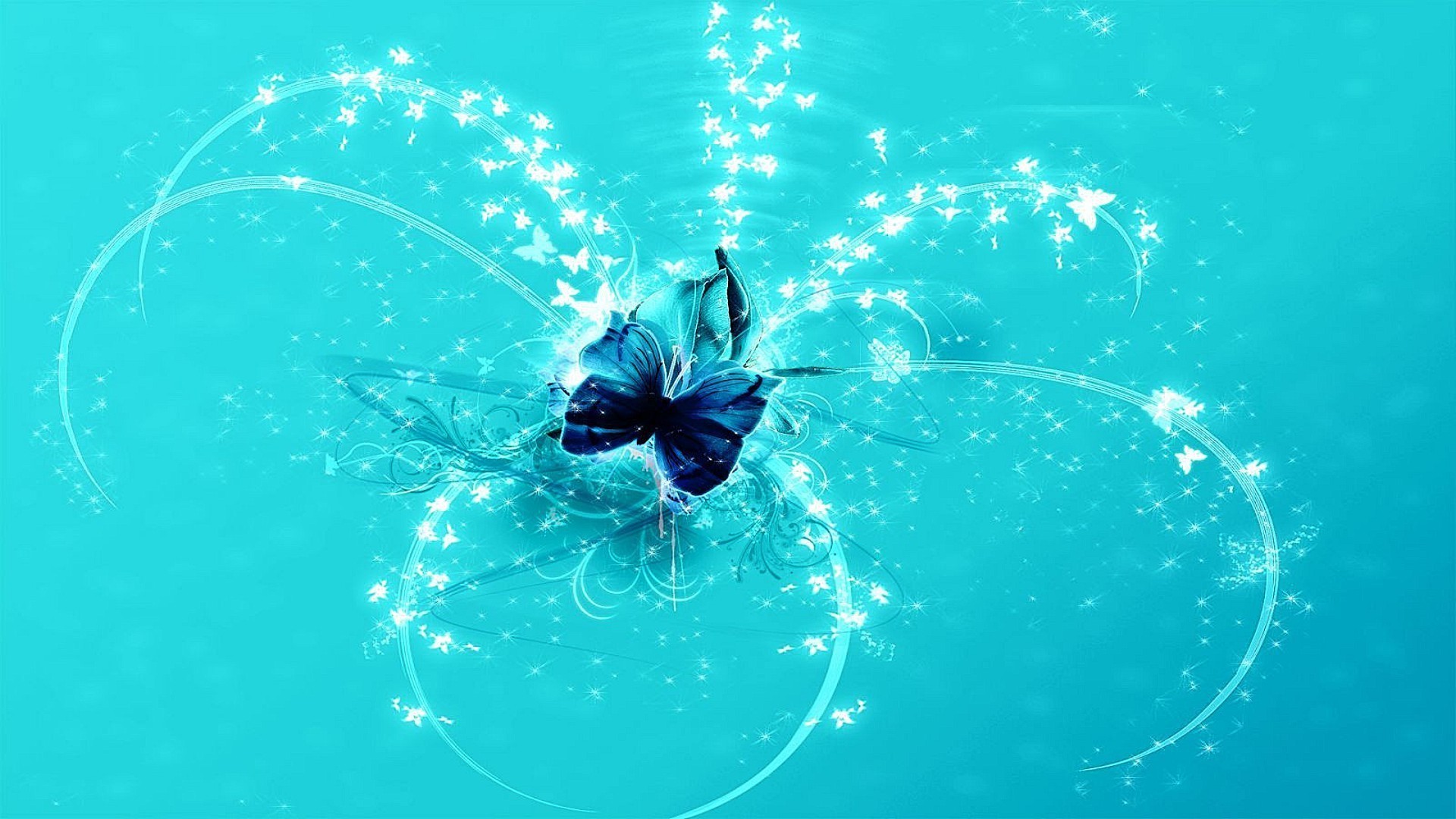 Blauer Schmetterling liegt auf azurblauem Wasser