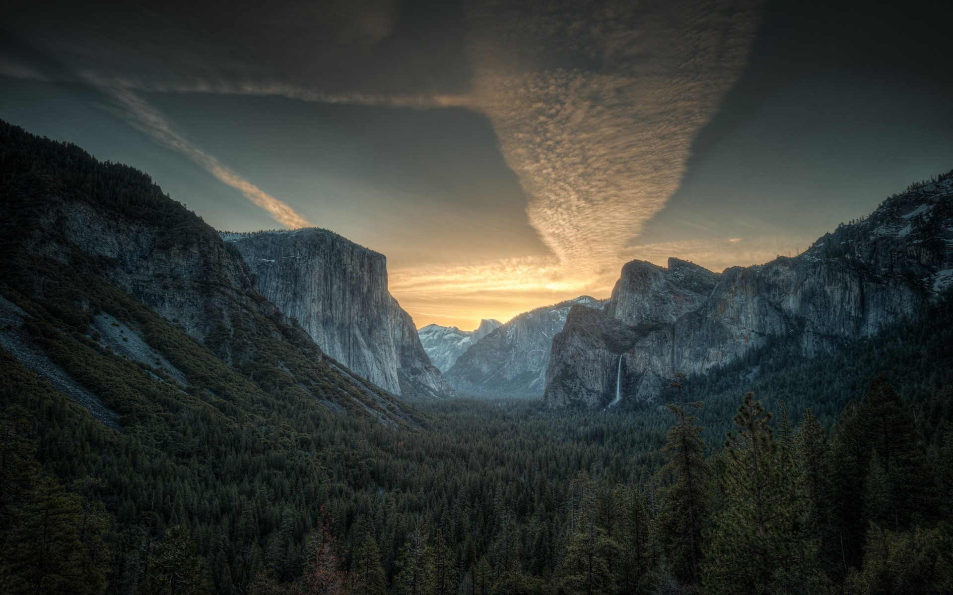Bild eines Sonnenuntergangs zwischen Bergen und Flüssen